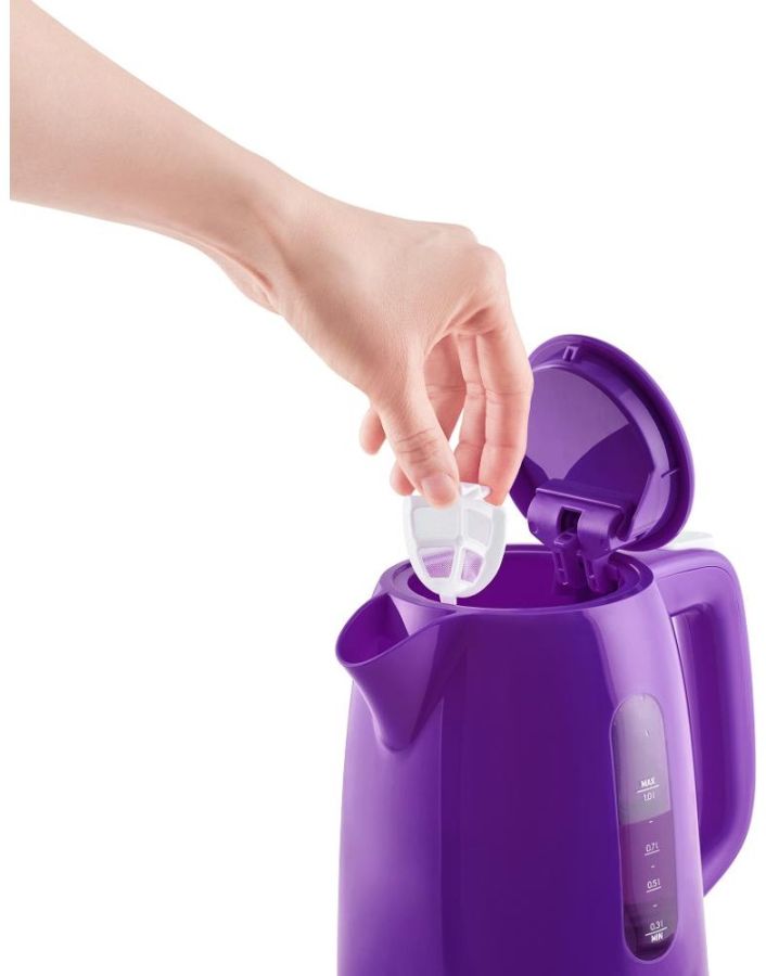 Obsah balení: Rychlovarná konvice, 360° základna s úložným prostorem pro napájecí kabel, Vyjímatelný filtr proti vodnímu kameni