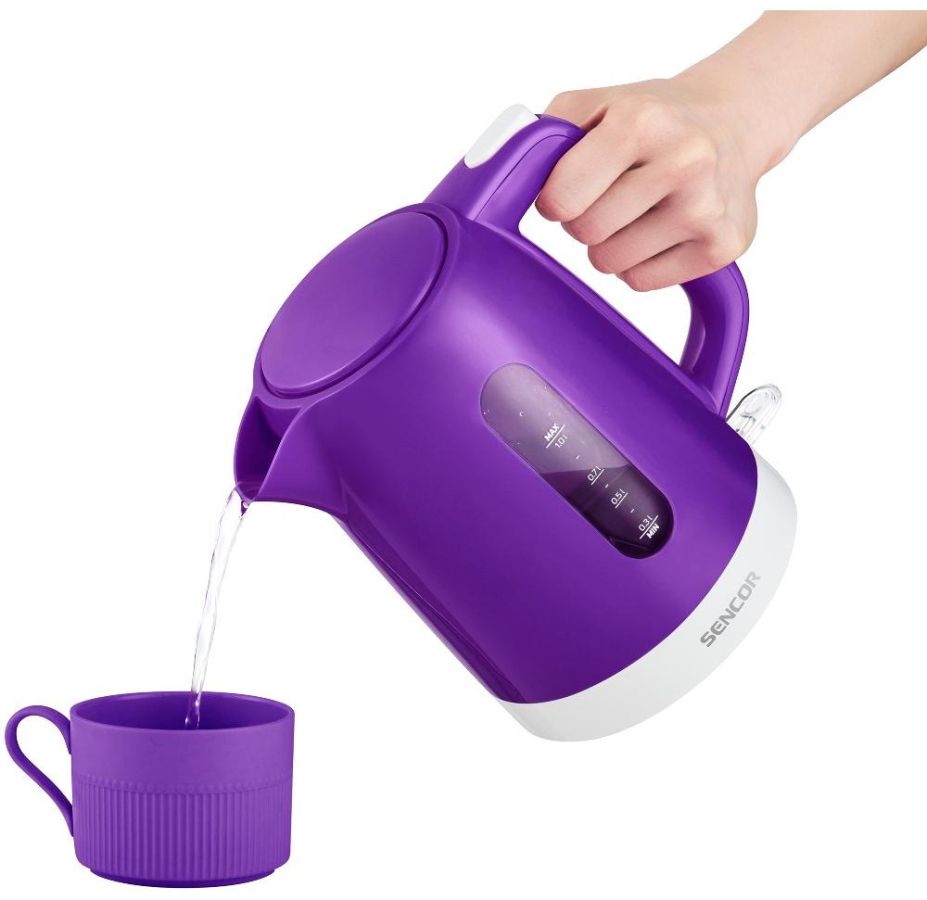 Plastová rychlovarná konvice o objemu 1 l. Má průhledný vodoznak, světelnou signalizaci provozu a skryté topné těleso.