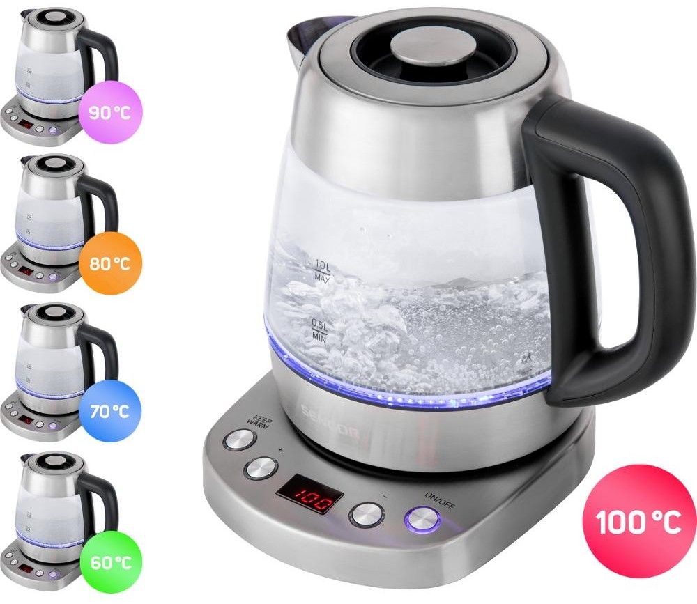 Rychlovarná konvice o objemu 1 l, elektronickou regulaci teploty s nastavením teploty a 3 režimy ohřevu. Trojitý bezpečnostní systém.