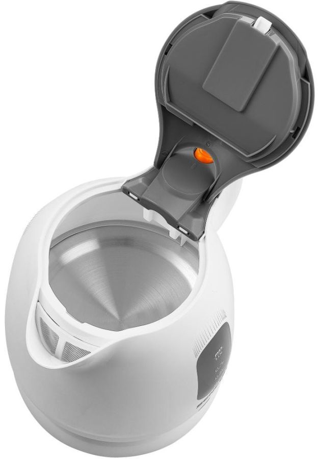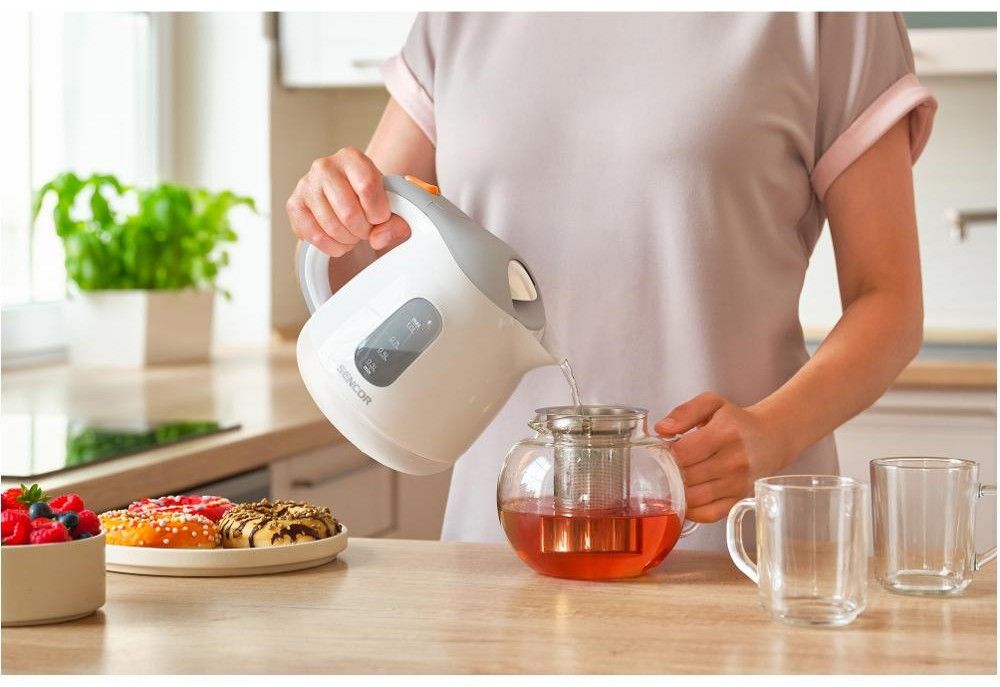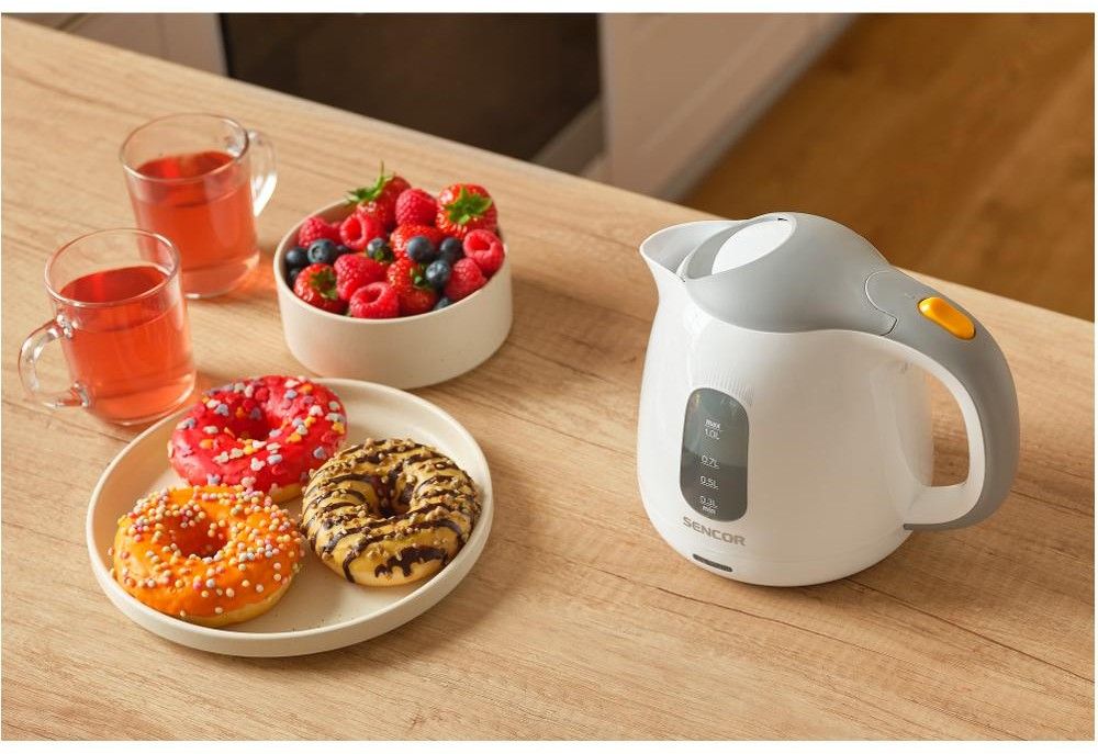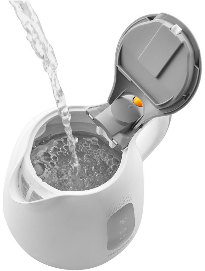 Plastová rychlovarná konvice o objemu 1 l. Má oboustranný vodoznak, světelnou signalizaci provozu a skryté topné těleso.