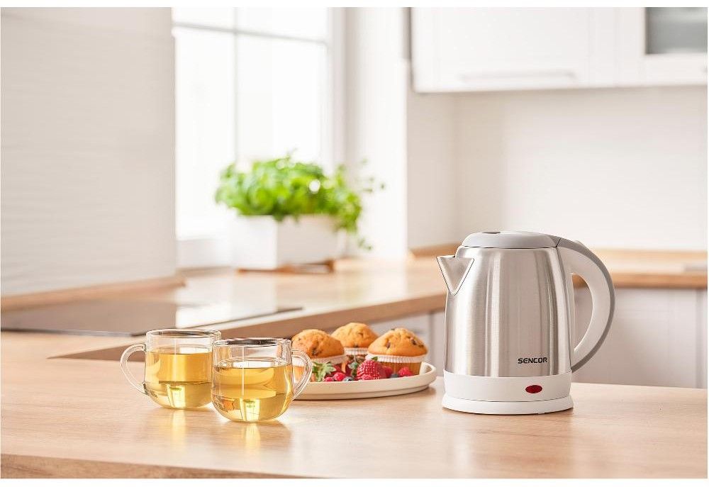 Rychlovarná konvice o objemu 1,2 l. Má bezpečnostní ochranu proti zapnutí bez vody a ochranu proti přehřátí.