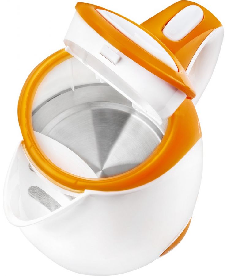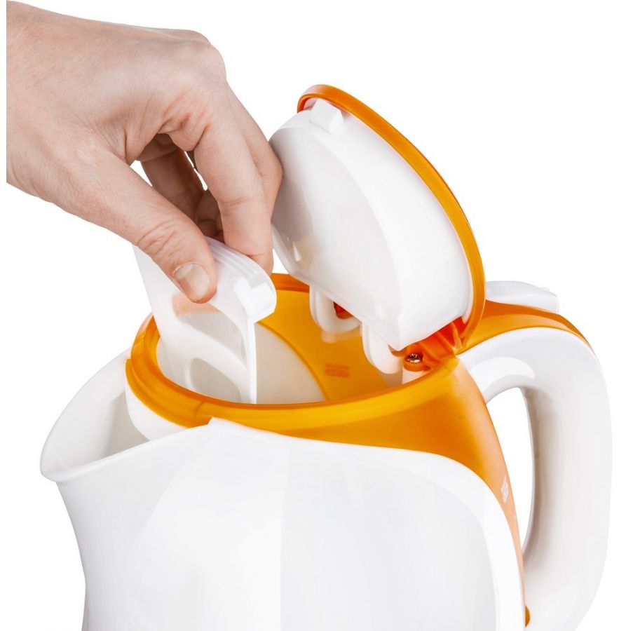 Plastová rychlovarná konvice o objemu 1,5 l. Má oboustranný vodoznak trojnásobné bezpečnostní jištění, filtr pro zachycení nečistot a usazenin, světelnou kontrolku zapnutí a zakrytou topnou spirálu.