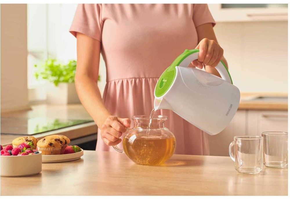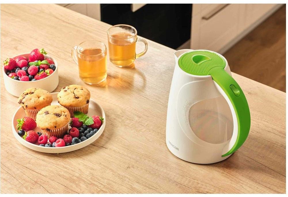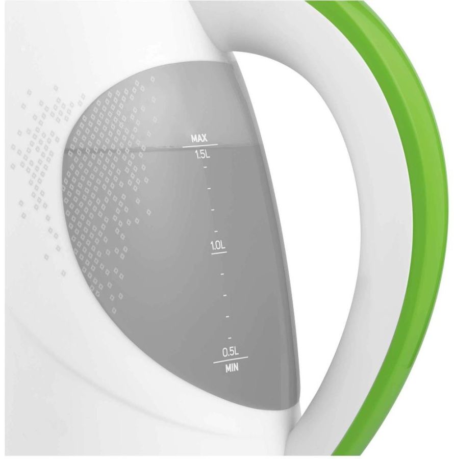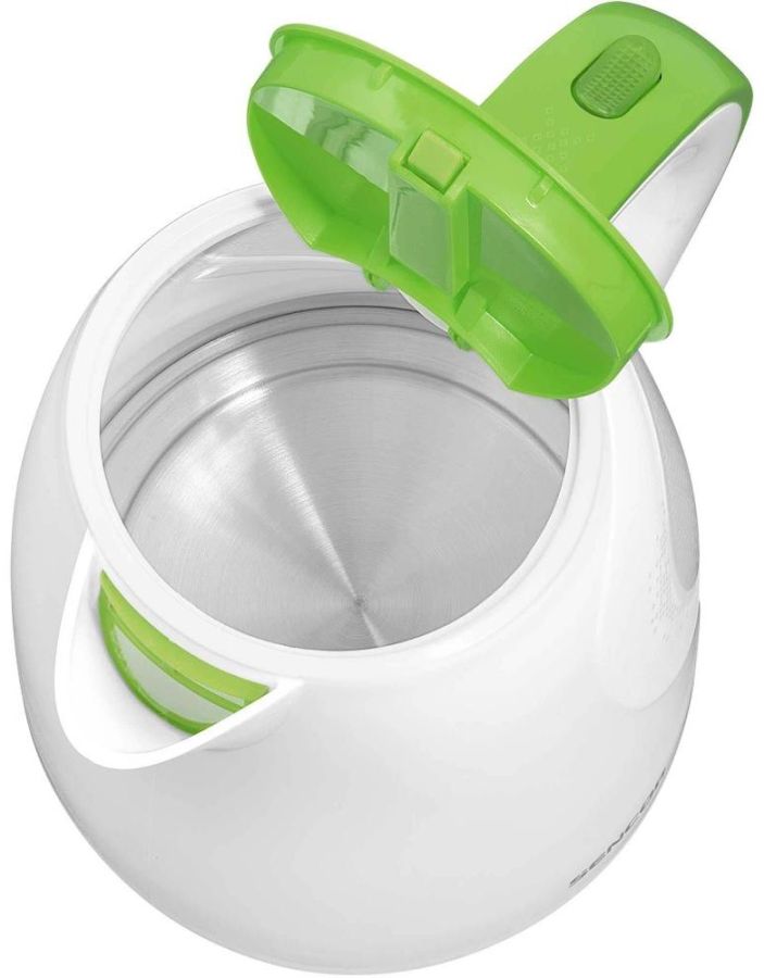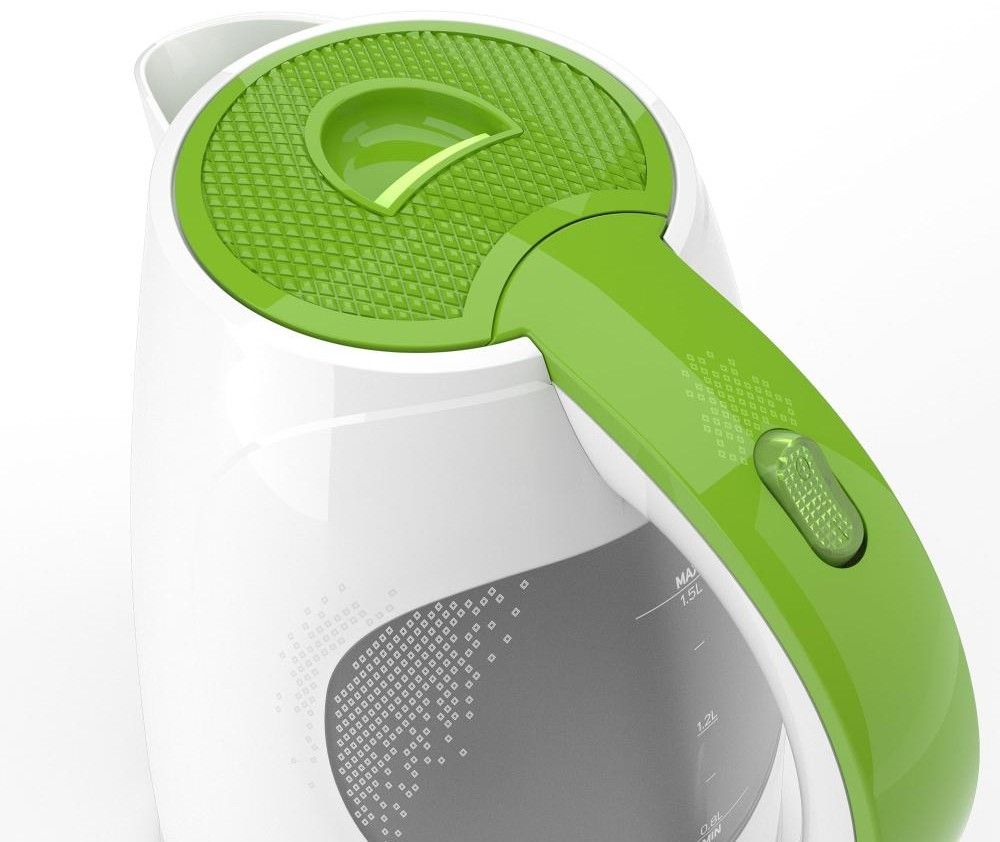 Plastová rychlovarná konvice o objemu 1,5 l. Má bezpečnostní jištění, filtr pro zachycení nečistot a usazenin, světelnou kontrolku zapnutí a zakrytou topnou spirálu.