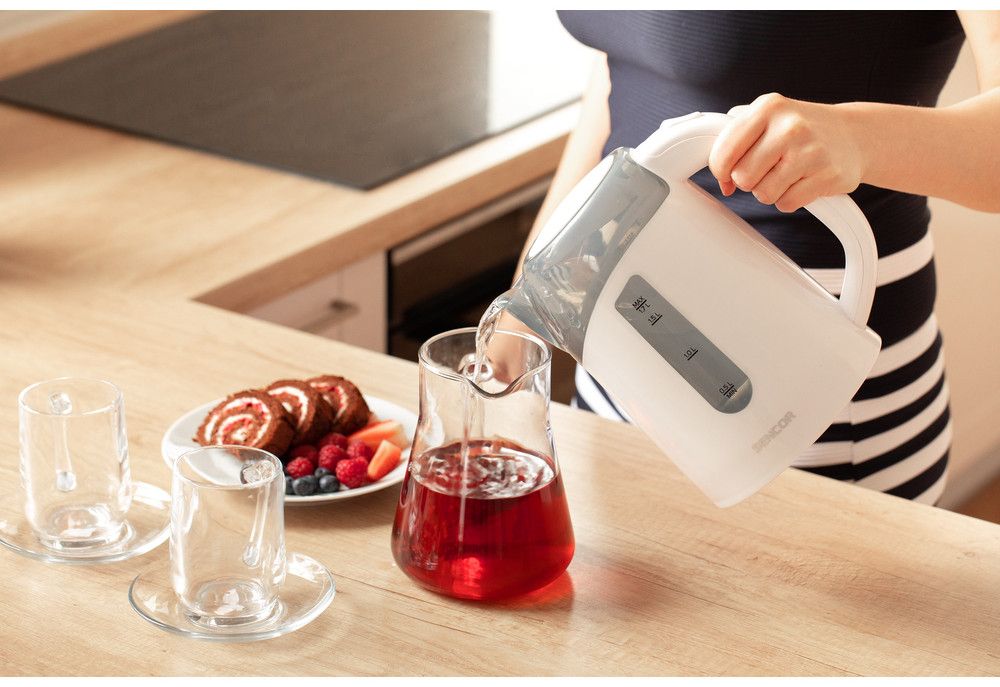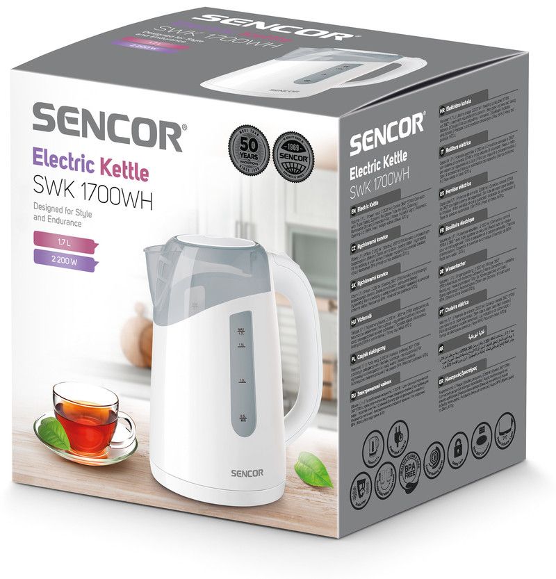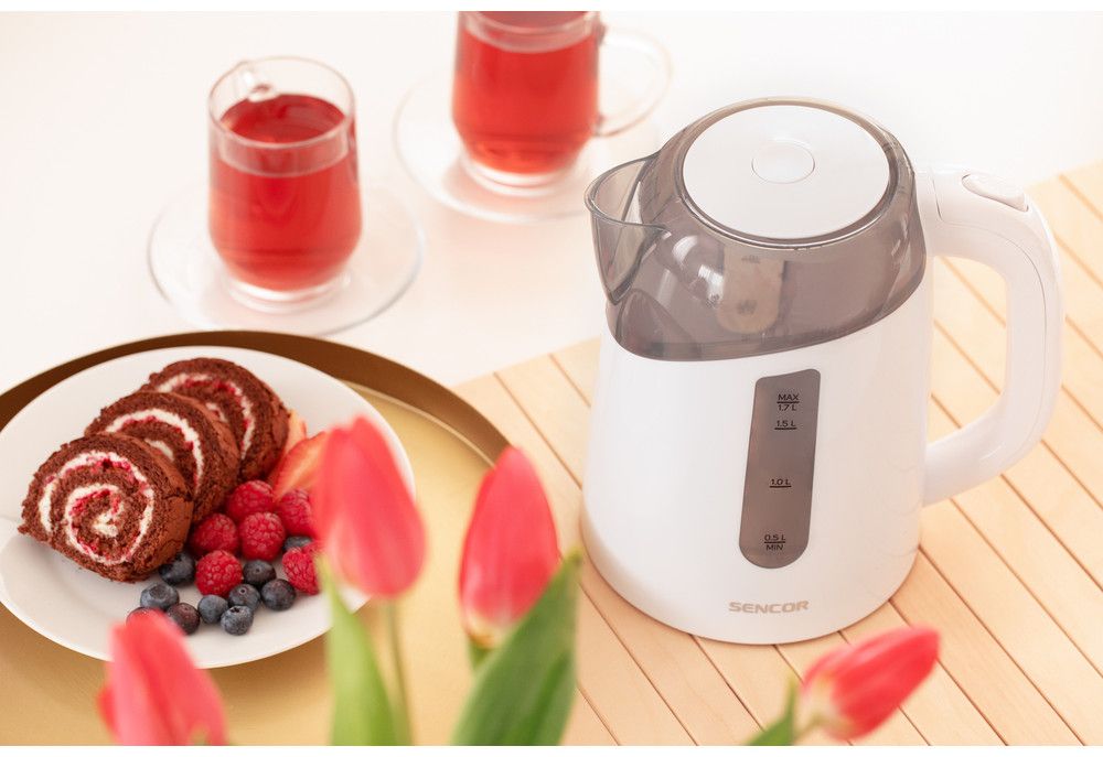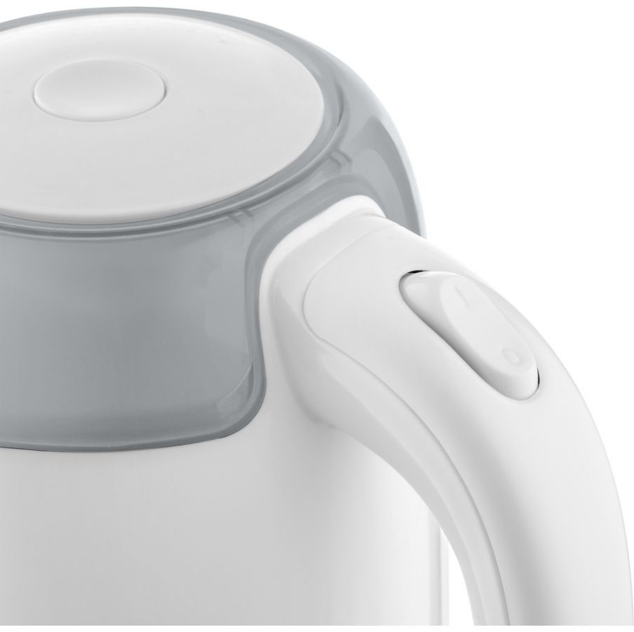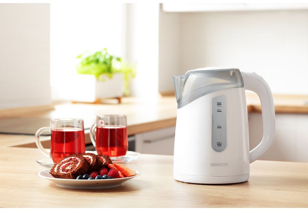 Plastová rychlovarná konvice o objemu 1,7 l. Má trojnásobné bezpečnostní jištění, zakrytou topnou spirálu a indikátor napájení.