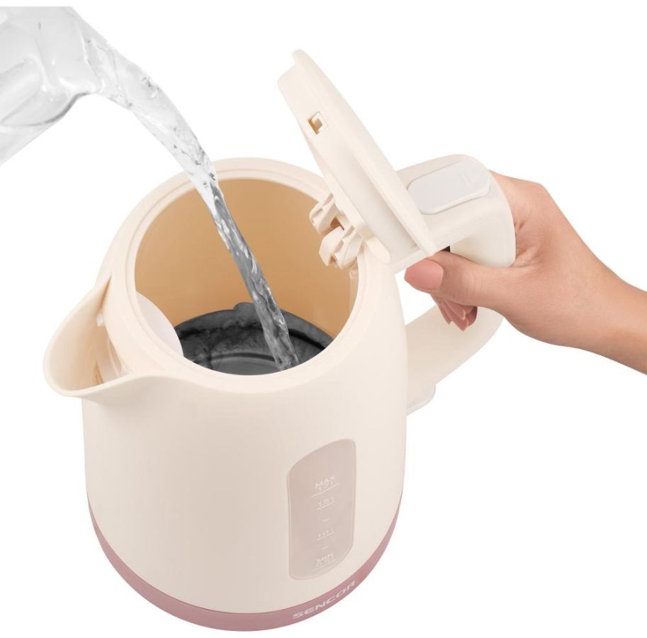 Plastová rychlovarná konvice o objemu 1 l. Má průhledný vodoznak, světelnou signalizaci provozu a skryté topné těleso.