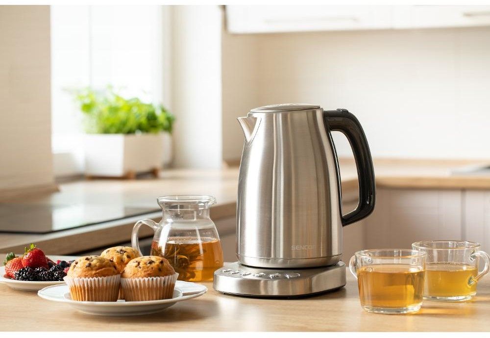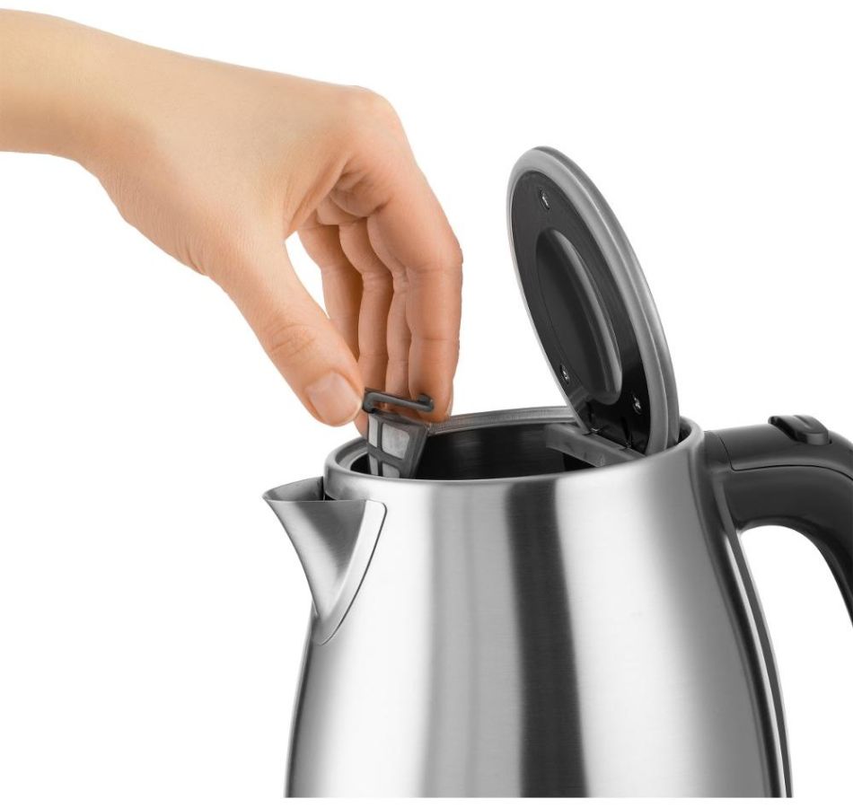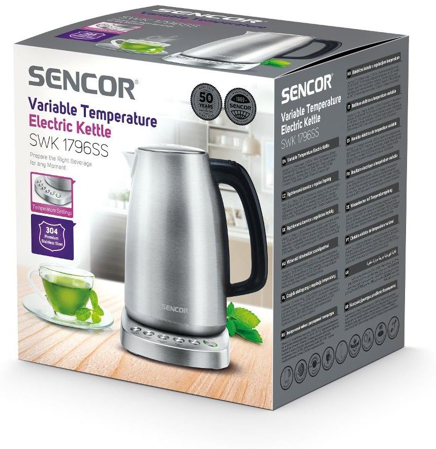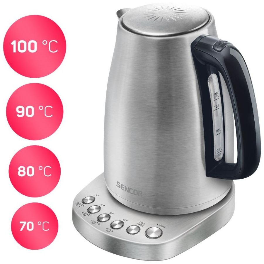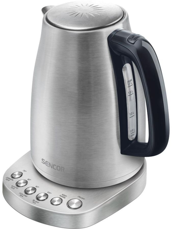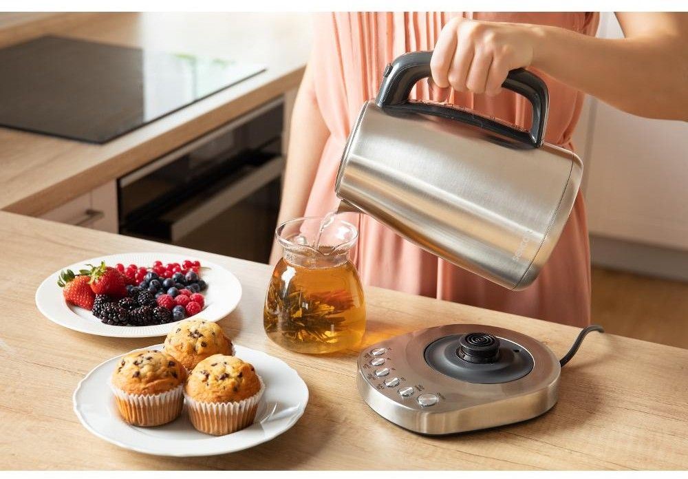 Nerezová rychlovarná konvice o objemu 1,7 l, elektronickou regulaci teploty s nastavením teploty a 3 režimy ohřevu. Trojitý bezpečnostní systém.