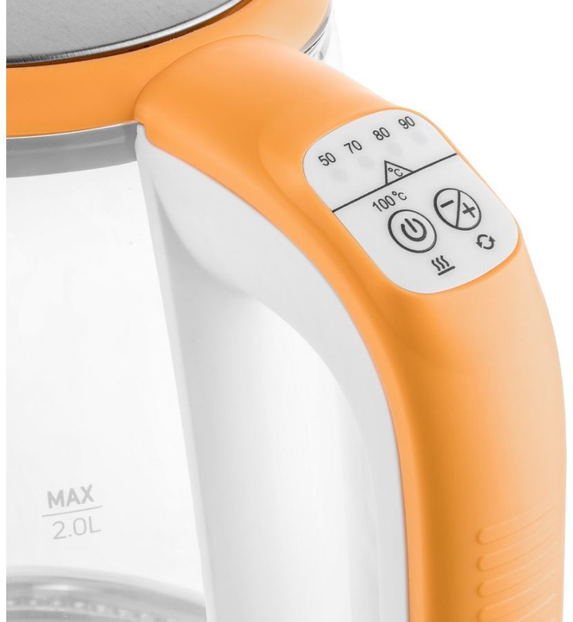 Chytrá rychlovarná konvice o objemu 2 l. Má regulaci teploty, LED osvětlení, trojnásobné bezpečnostní jištění a zakrytou topnou spirálu.