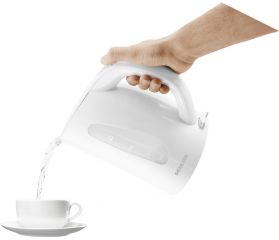 Plastová rychlovarná konvice o objemu 1,5 l. Má oboustranný vodoznak s modrým podsvícením, trojnásobné bezpečnostní jištění, světelnou indikaci provozu a zakrytou topnou spirálu.