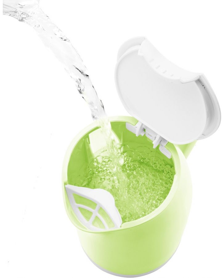 Designově špičková konvice. Použitý moderní plast (používá se i pro mobilní telefony), není cítit ani po vyvaření. Stále si udržuje krásný lesk. Vše je doplněno modře podsvíceným vypínačem a vodoznakem, který je také podsvícený a uložený po obou stranách konvice.