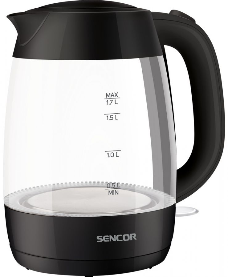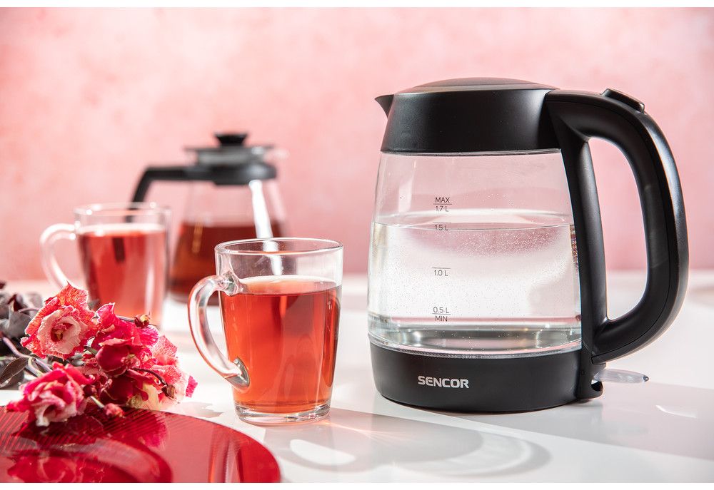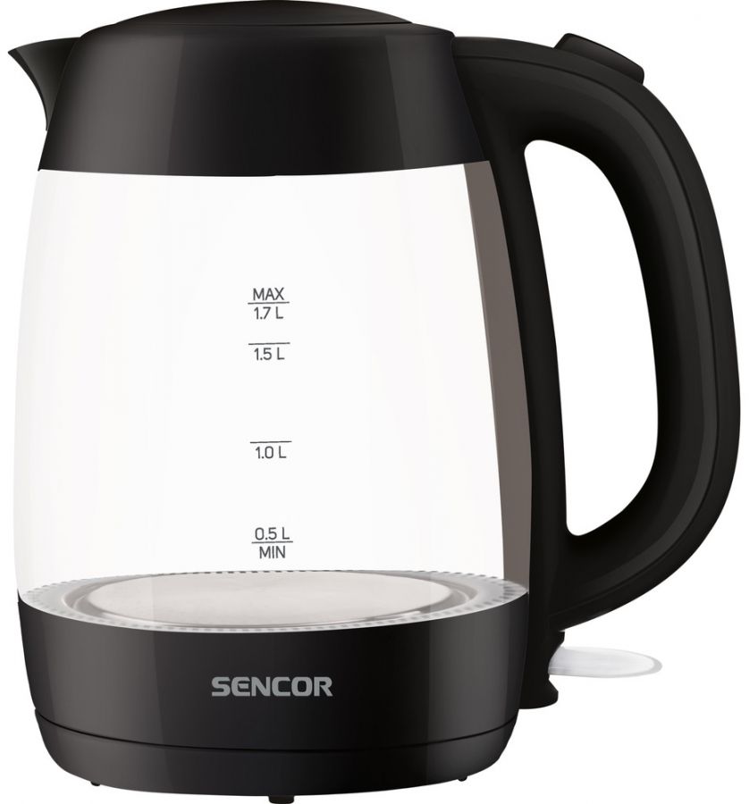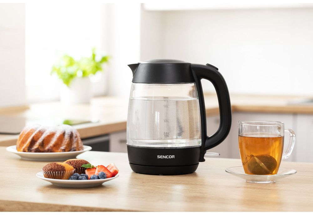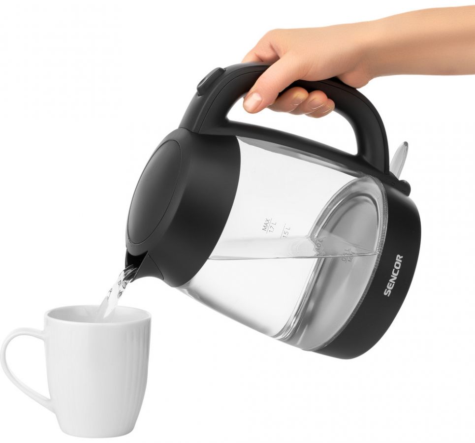 Skleněná rychlovarná konvice o objemu 1,7 l. Dvojité bezpečnostní jištění a zakrytou topnou spirálu.
