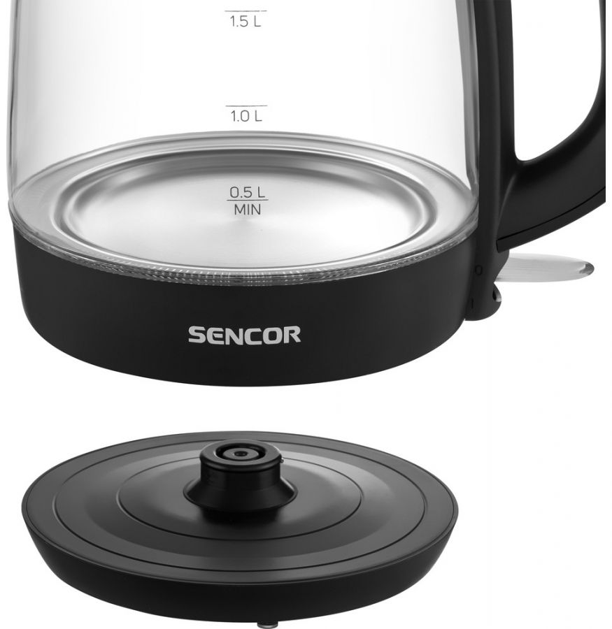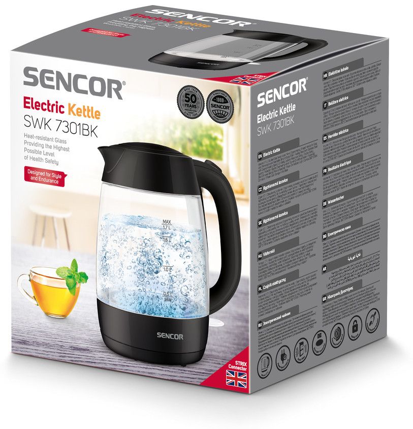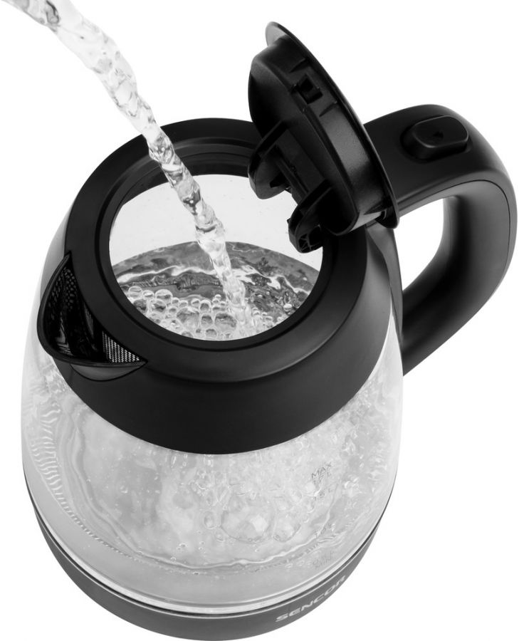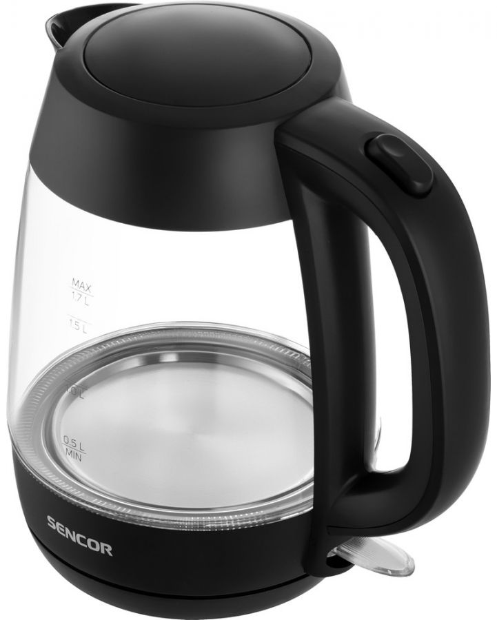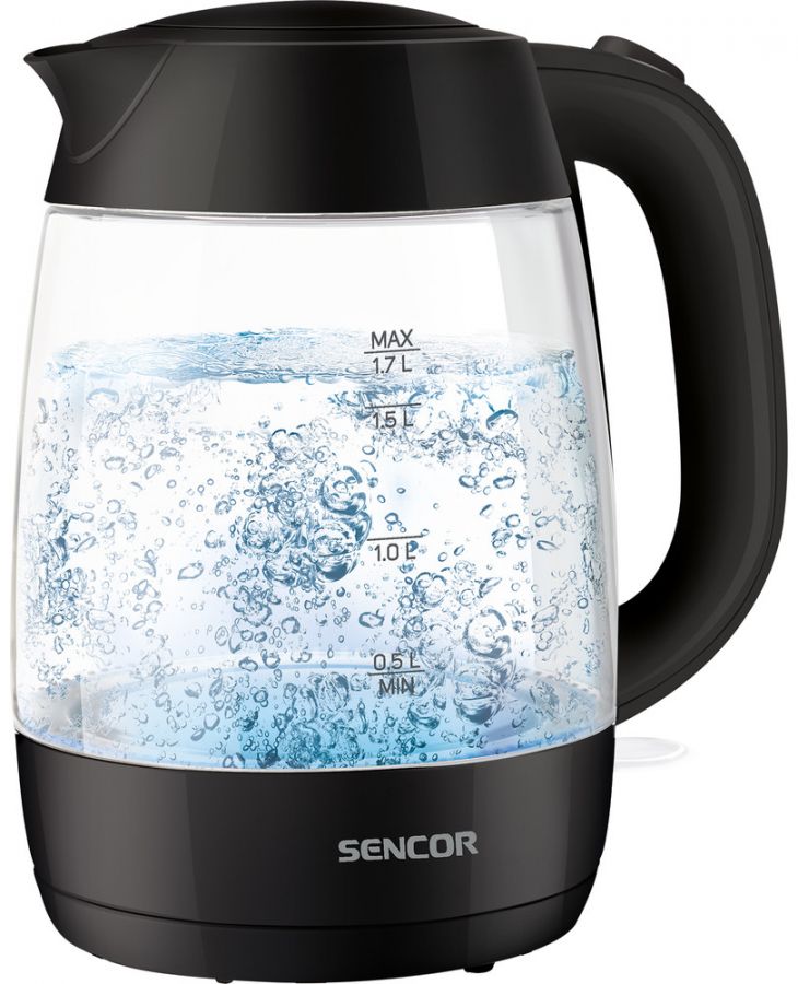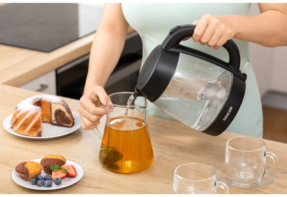 Skleněná rychlovarná konvice o objemu 1,7 l. Dvojité bezpečnostní jištění a zakrytou topnou spirálu.