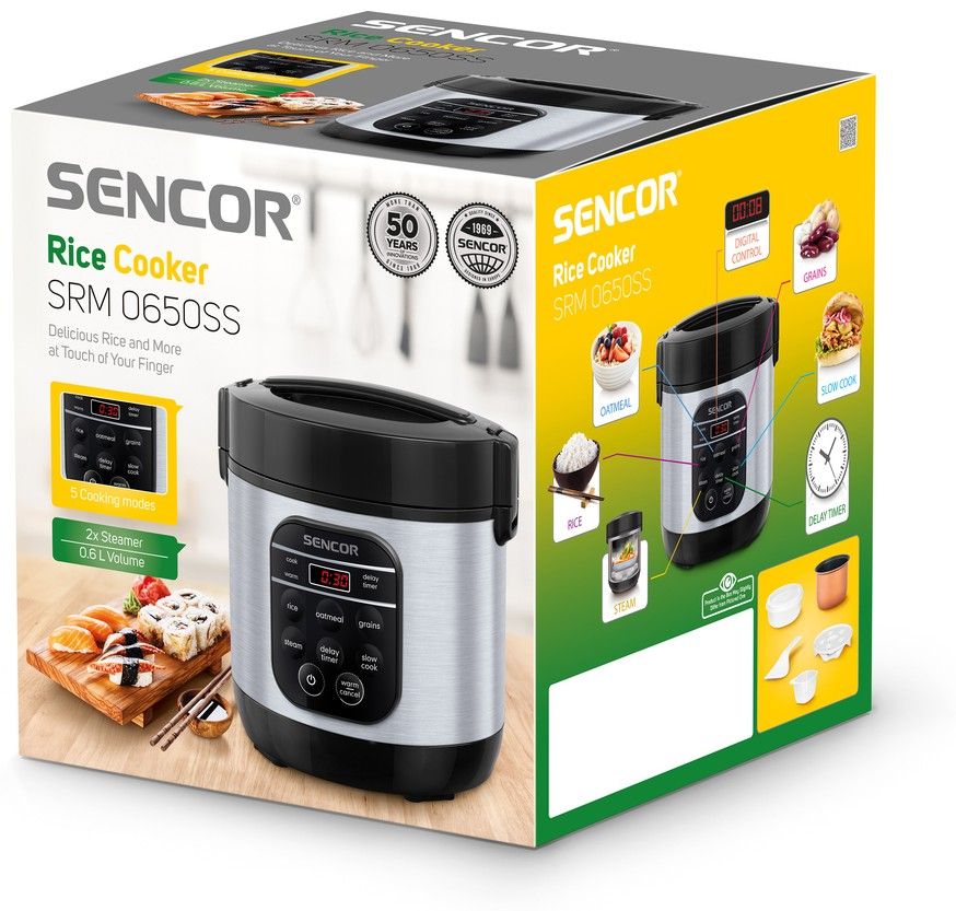 Multifunkční rýžovar je hrnec na vaření 450 g rýže s objemem 0,6 l a 5 speciálními režimy vaření.