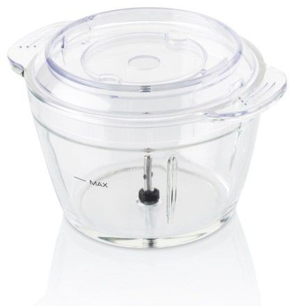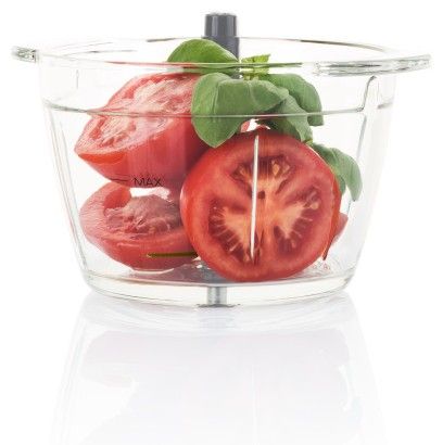 Sekáček se skleněnou nádobou a ostrým titanovým nožem pro dokonalé rozsekání a rozmixování potravin.