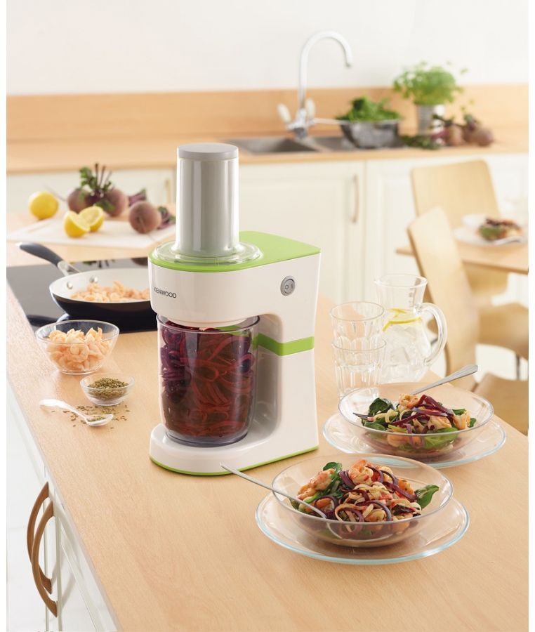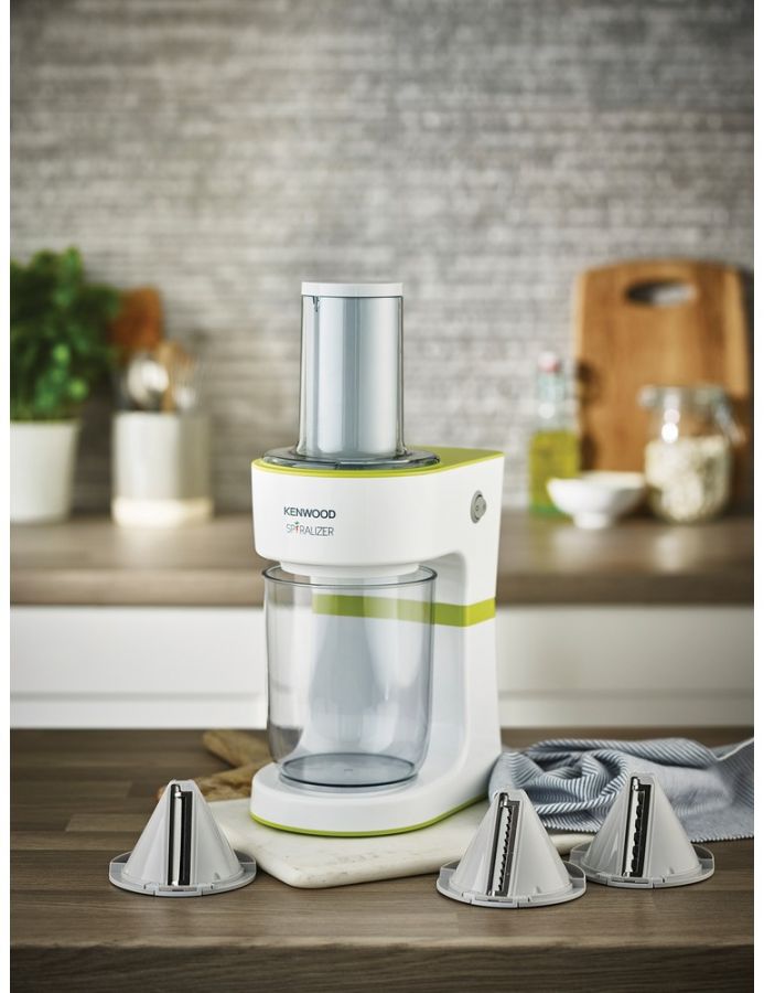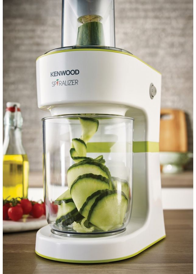 Tento nový Kenwood Spiralizér vnese zábavu do vaší rutiny zdravého vaření. Umožní vám proměnit nudnou zeleninu a ovoce na variace spirál, špaget a nudlí, které dokonale nahradí ve vašem jídelníčku těstoviny, rýži či brambory. Spiralizér se snadno používá, nezanechává žádný nepořádek, je kompaktní a poradí si s celou řadou druhů zeleniny a ovoce