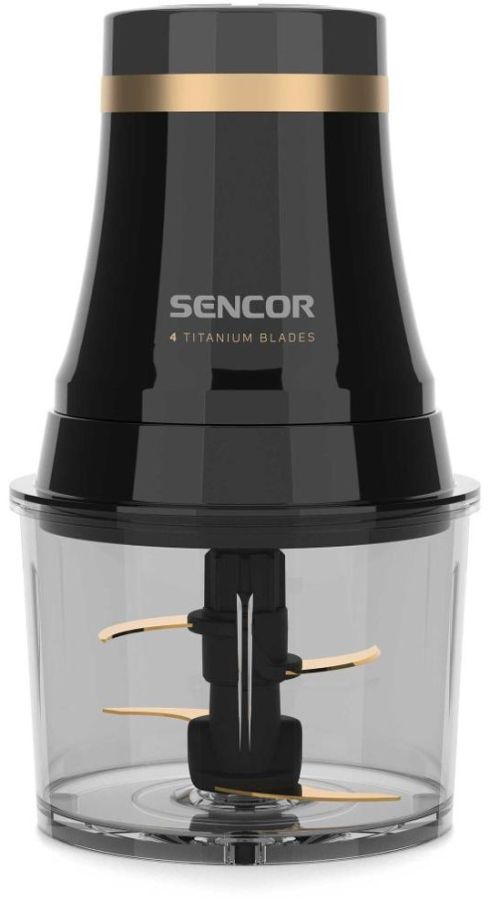 - Plastová nádoba o objemu 1 l a 4 nože s vrstvou zlata a titanu pro všechny druhy sekání potravin;