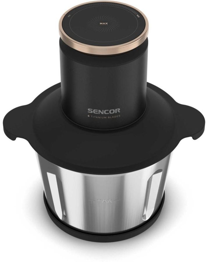 Sekáček má výkonný 800W motor, 9 titanových nožů a nádobu z nerezavějící oceli o objemu 3 l.