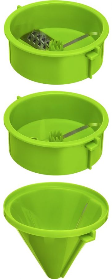 Navrženo s velkokapacitní přípravnou nádobou, ve které jsou nudle shromažďovány, což usnadňuje přidávání spirál k ostatním ingrediencím. Pěchovadlo a plnící otvor společně zavádí zeleninu do čepele, kde je dosaženo dokonalého výsledku.