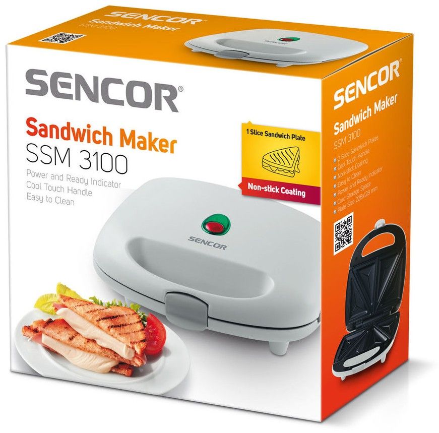 Od sendvičovače Sencor SSM 3100 dostanete přesně to, co očekáváte - dozlatova propečený sendvič. Vedle chutného jídla ale tato novinka od Sencoru nabízí i tolik potřebný uživatelský komfort a bezproblémovou údržbu. Vnitřek sendvičovače tvoří nepřilnavá pečicí plocha, která zajišťuje, aby se vám toast nepřipálil. V případě potřeby se tento povrch samozřejmě dá velmi snadno čistit za pomoci papírového ubrousku bez použití saponátu. Pečicí plocha je uspořádána do oblíbených čtyř trojúhelníkových sendvičů a její tvar zajistí, že všechny ingredience zůstanou uvnitř sendviče. Je jen na vás, zda si současně připravíte 2 nebo 4 trojúhelníkové sendviče.