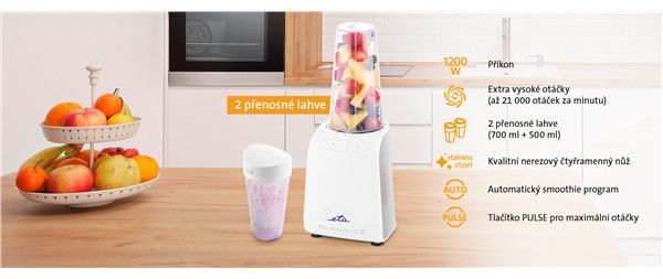S praktickým a výkonným mixérem ETA Blendic Team II si pohodlně připravíte jak výživné smoothie a večerní koktejly, tak i dětské přesnídávky či pesta. Díky vysoké rychlosti až 21 000 otáček za minutu se vytouženého výsledku dočkáte dokonce během několika málo chvilek.