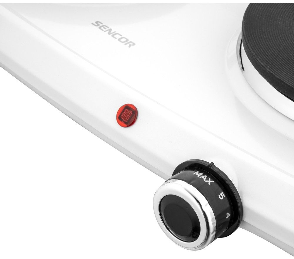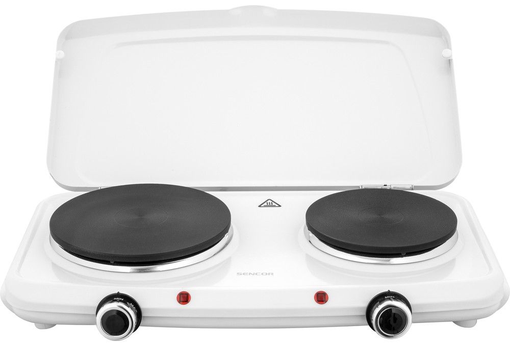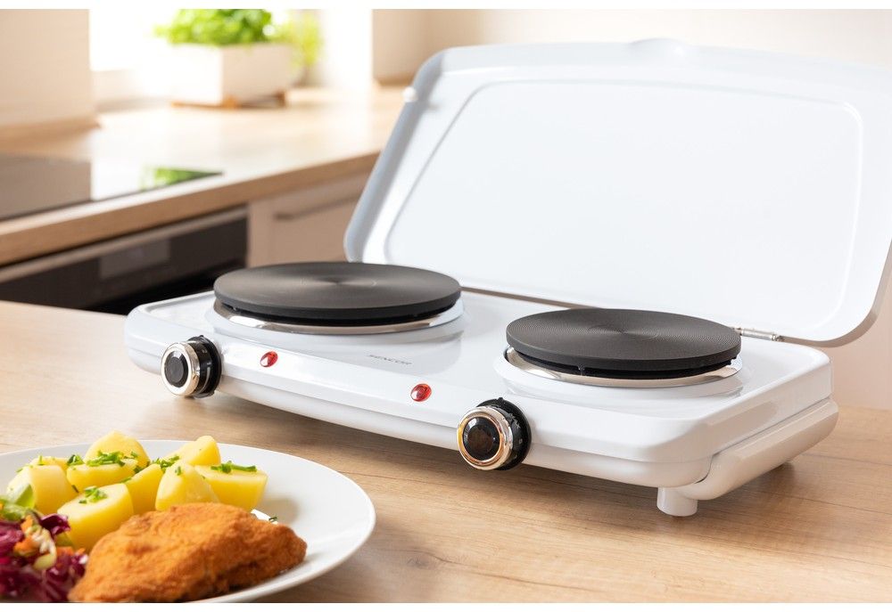 Dvouplotýnkový elektrický vařič. Má 2 litinové plotny, plynulou regulaci, světelnou signalizaci provozu a ochranu proti přehřátí. Je vhodný na chalupu, do menších bytů či studentských kuchyní.