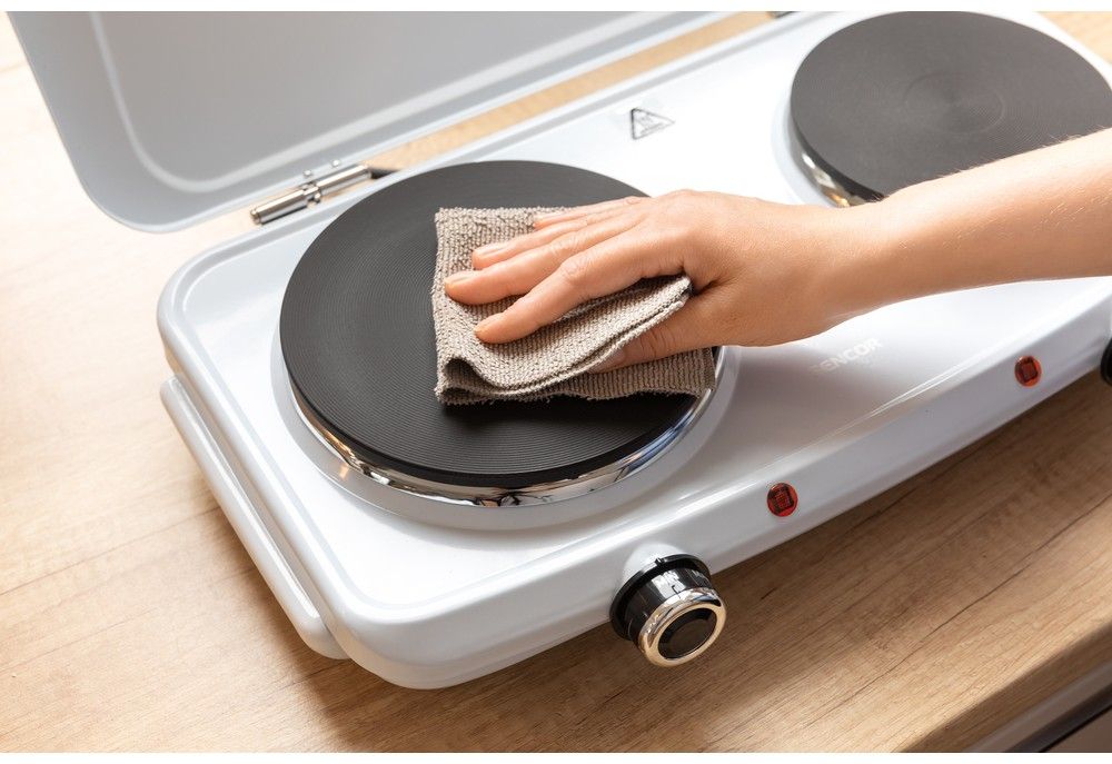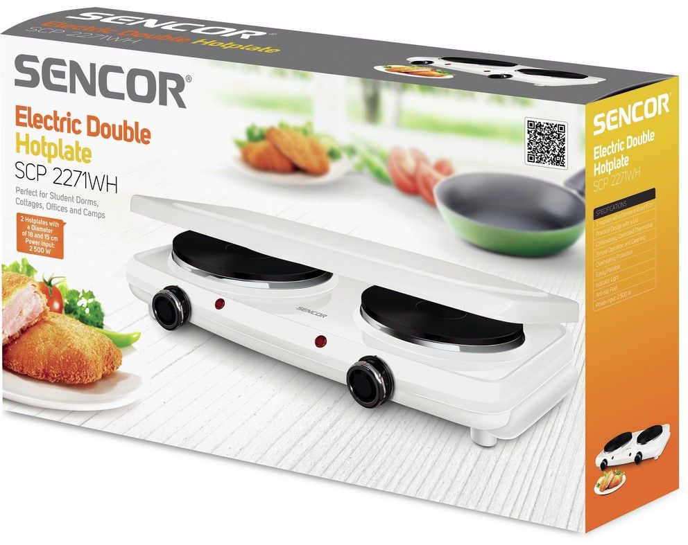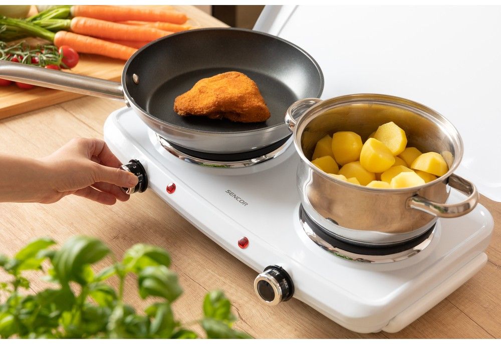 Svoje oblíbené dobroty si uvaříte i v malé kuchyni. Jsem elektrický vařič Sencor SCP 2271WH-EUE4, okouzlím vás svými kompaktními rozměry, nízkou hmotností a praktickým víkem. Můžete si mě vzít s sebou třeba na dovolenou, ale skvěle posloužím kdekoli, kde je na vaření málo místa. Mám vysoký příkon a dvě kvalitní litinové plotýnky, takže se rychle rozpálím a nevyžaduju speciální vané nádobí. Teplotu můžete plynule regulovat díky otočným knoflíkům. Už víte, co si na mně uvaříte?