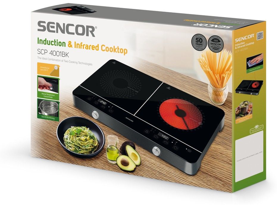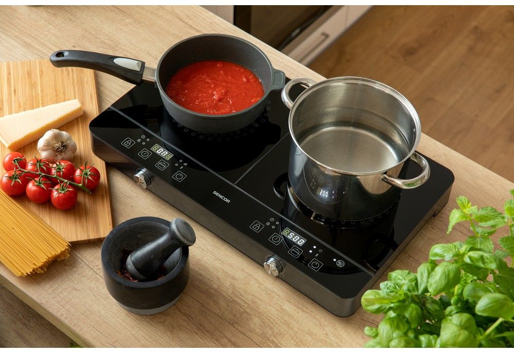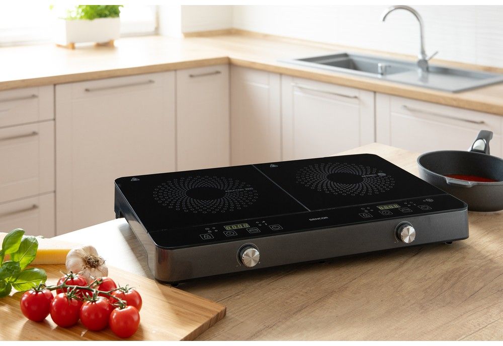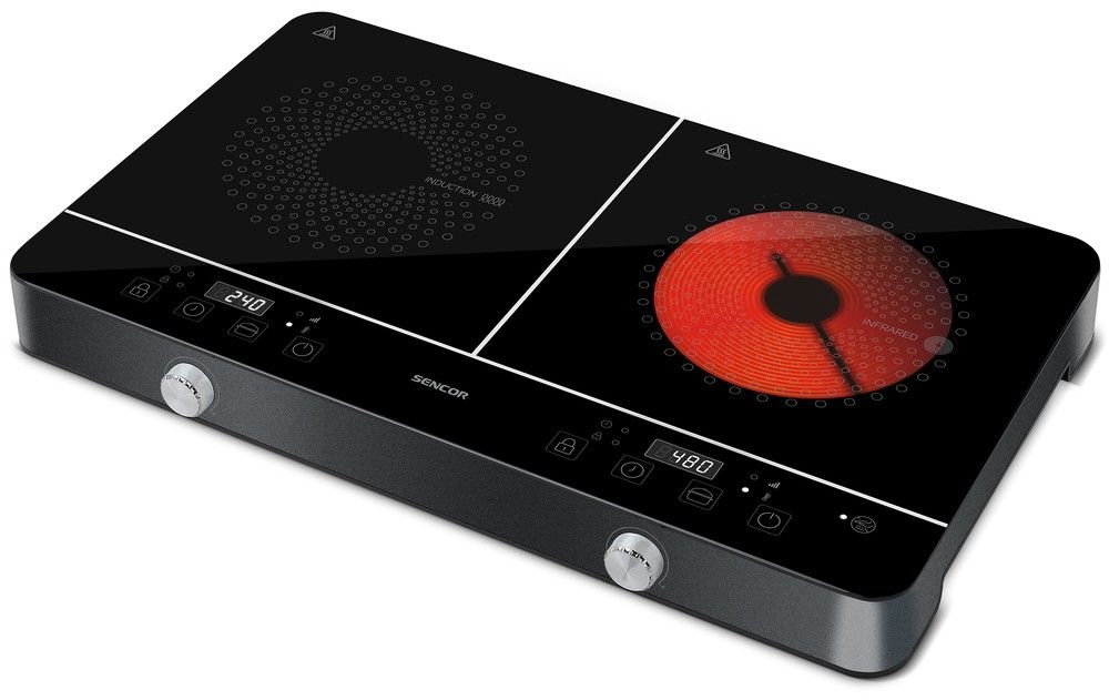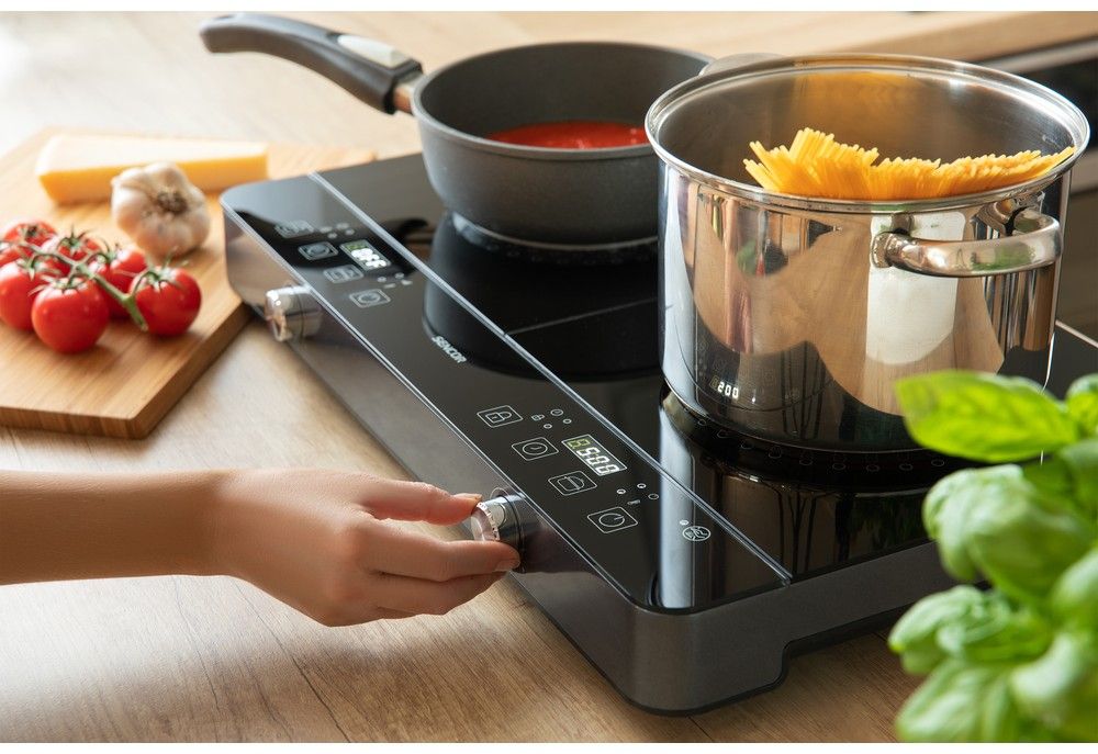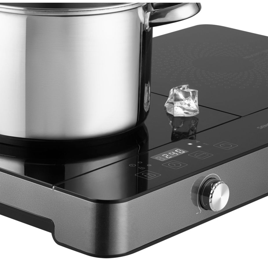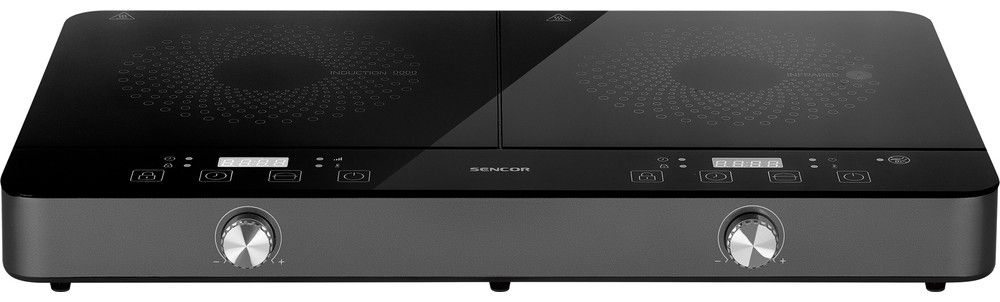 Dvouzónový indukční vařič se 2 sklokeramickými dotykovými varnými deskami v kombinaci s klasickým otočným ovladačem a velkým LCD displejem.