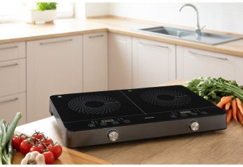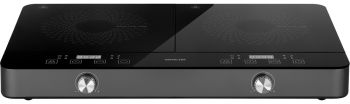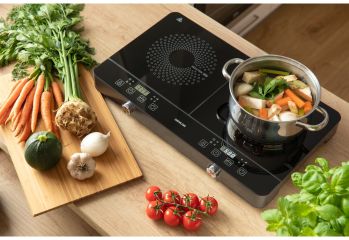 Dvouzónový indukční vařič se 2 sklokeramickými dotykovými varnými deskami v kombinaci s klasickým otočným ovladačem a velkým LCD displejem.