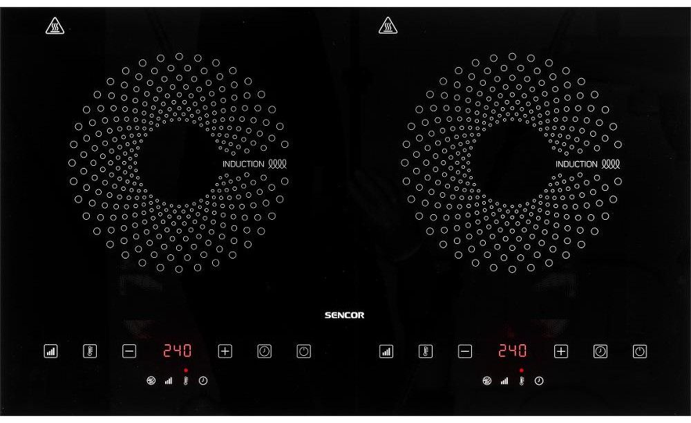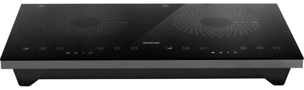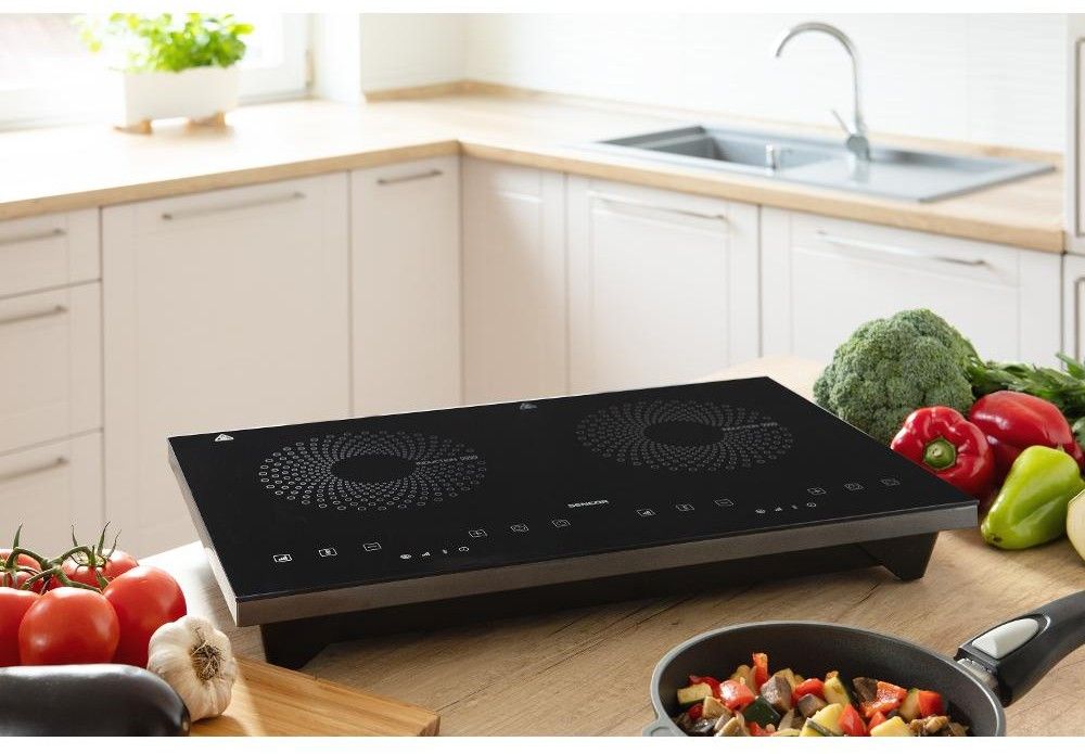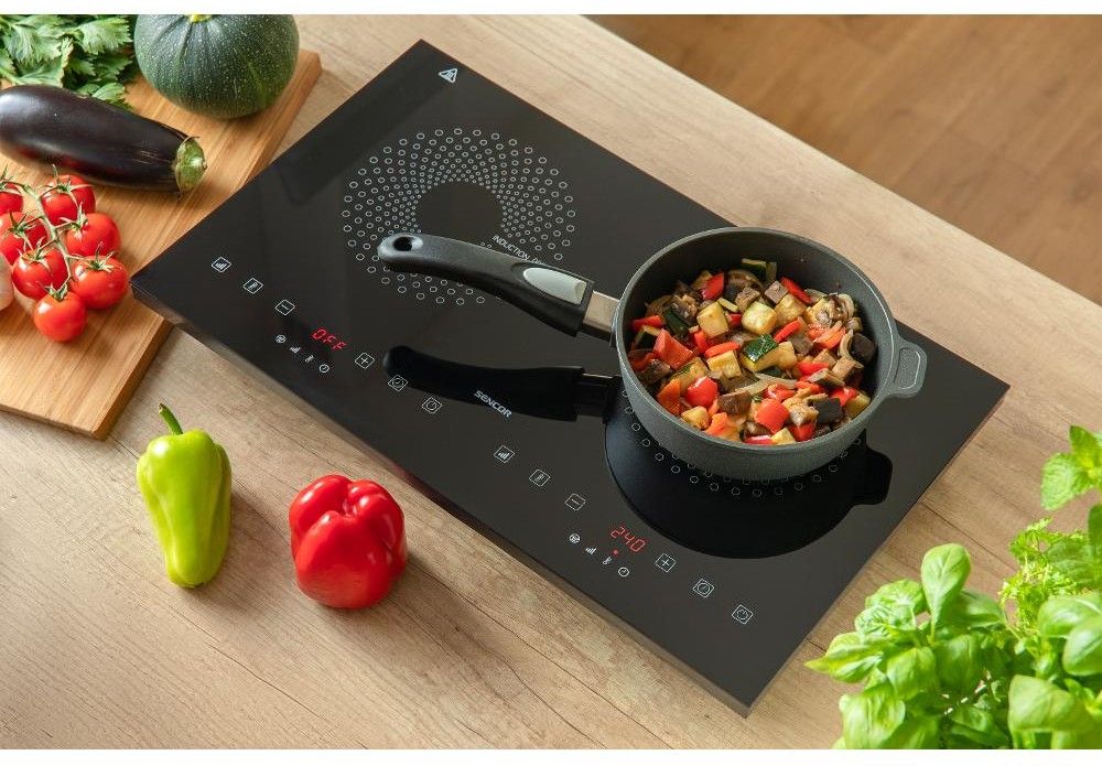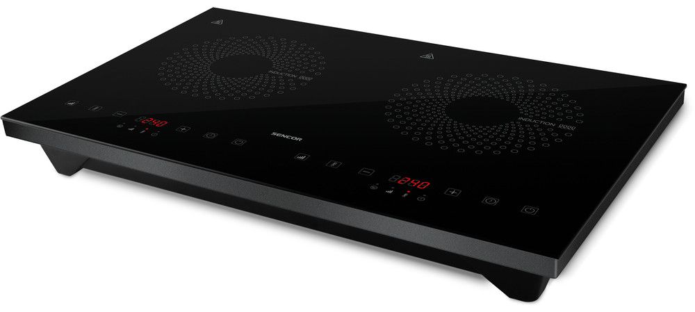 Dvouzónový indukční vařič se 2 sklokeramickými dotykovými varnými deskami a velkým LCD displejem.