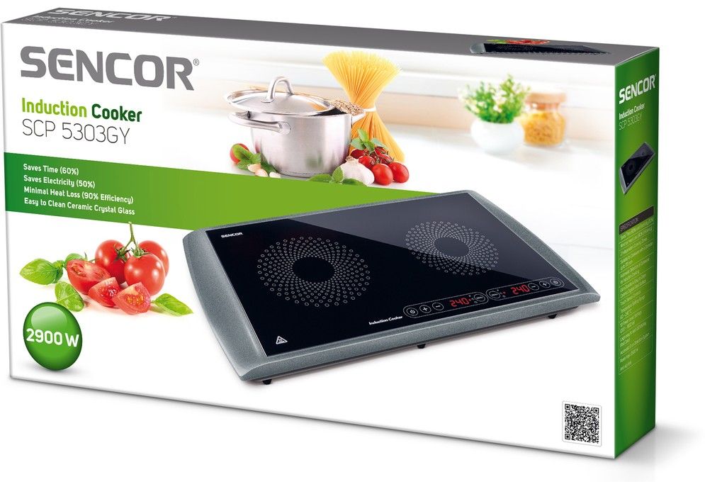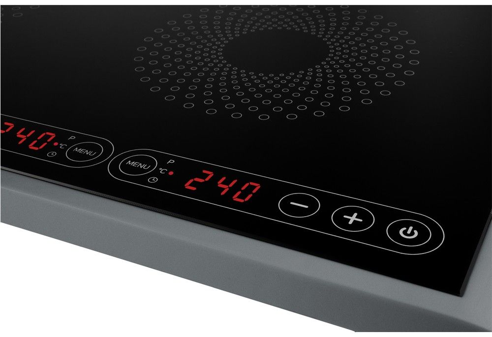 Dvouzónový indukční vařič se 2 sklokeramickými dotykovými varnými deskami o průměru 145 a 167 mm a velkým LCD displejem.