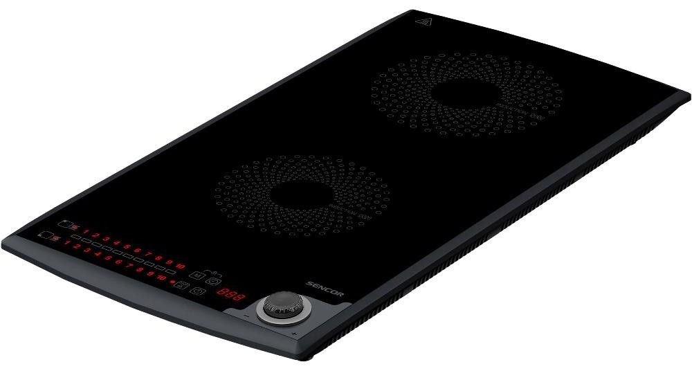 Dvouzónový indukční vařič se 2 sklokeramickými dotykovými varnými deskami, intuitivním dotykovým ovládáním a otočným ovladačem.