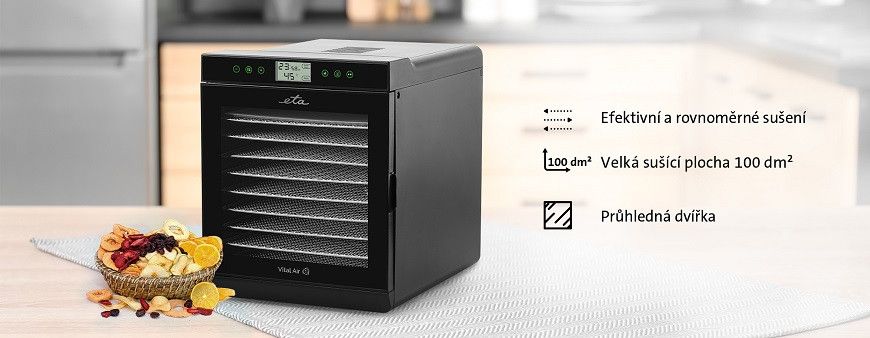 Sušička potravin ETA Vital Air II otevírá dveře do světa výroby poctivých domácích pochoutek. Poradí si se sušením veškerého ovoce, zeleniny i hub, a dokonce i masa nebo ryb (domácí „jerky“). Šetrně nasuší i bylinky a domácí koření.