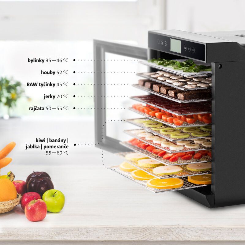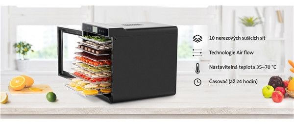 - Elektronický termostat zajišťuje žádoucí výkyvy teploty, při kterých dochází k optimálnímu a rychlému odstraňování vlhkosti z potravin