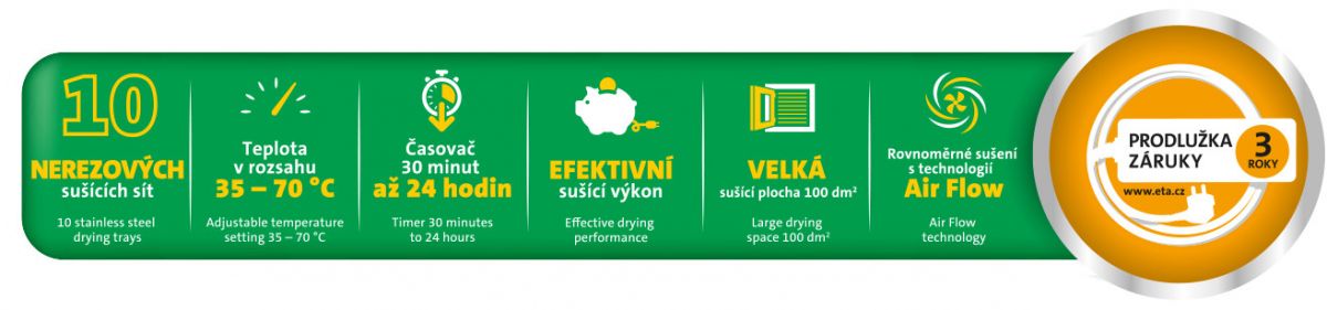 Záruku na motor sušičky ETA Vital Air II vám zdarma prodloužíme na 3 roky – stačí vyplnit registrační formulář. Bezplatnou službu Prodlužka záruky si registrujte ZDE.