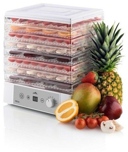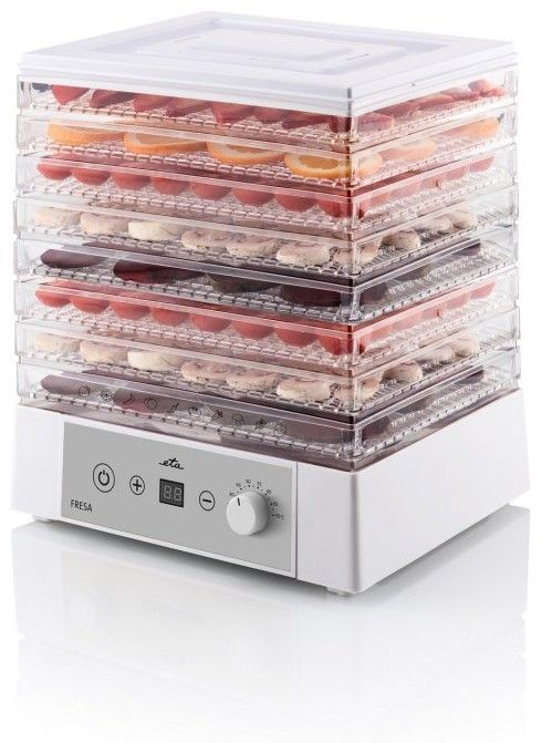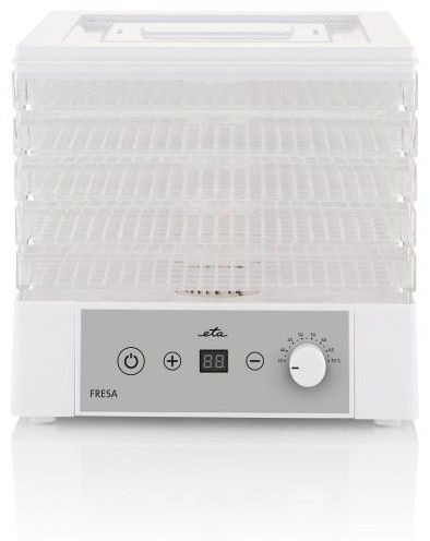 V sušičce potravin ETA FRESA můžete sušit ovoce, zeleninu, houby, ryby, maso (jerky) a bylinky. Součástí balení je 8 sušicích sít, jejichž počet můžete volit podle množství potravin. Balení obsahuje také speciální síto na bylinky. Sušicí síta jsou čirá, a tak máte proces sušení neustále pod kontrolou. Teplota sušení se odvíjí od typu potravin – snadno ji nastavíte v rozsahu 35–70 °C.