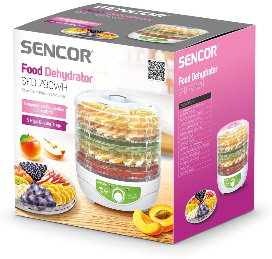 Sušička potravin suší ovoce, zeleninu, houby, bylinky, maso a jiné druhy potravin. Má 5 sušících sít, s nastavitelnou výškou, v základní výbavě.