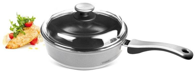 Masivní indukční pánev s nepřilnavým povrchem s přísadou titanu a praktickou skleněnou poklicí pro dušení pokrmů. Vhodná na všechny typy varných desek a do pečící trouby.
