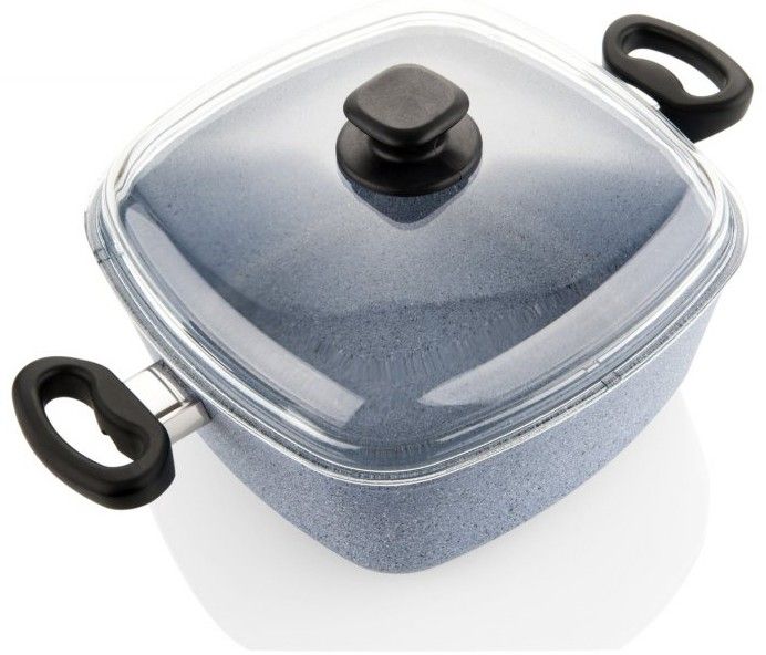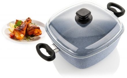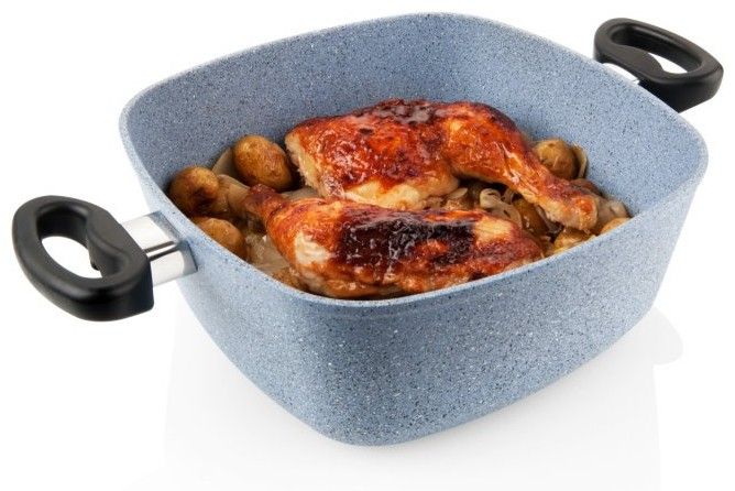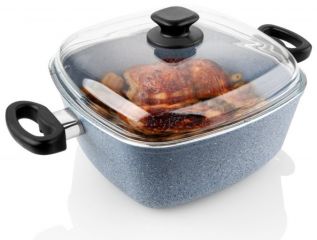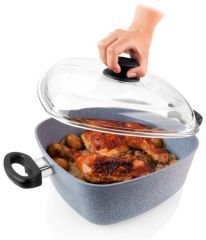 Čtyřhranný pekáč s nepřilnavým povrchem, granitovou vrstvou a skleněnou poklicí. Vhodný pro pečení kuřat, buchet a nákypů.