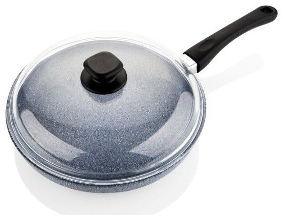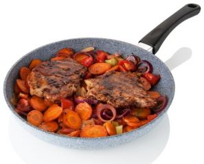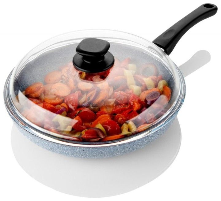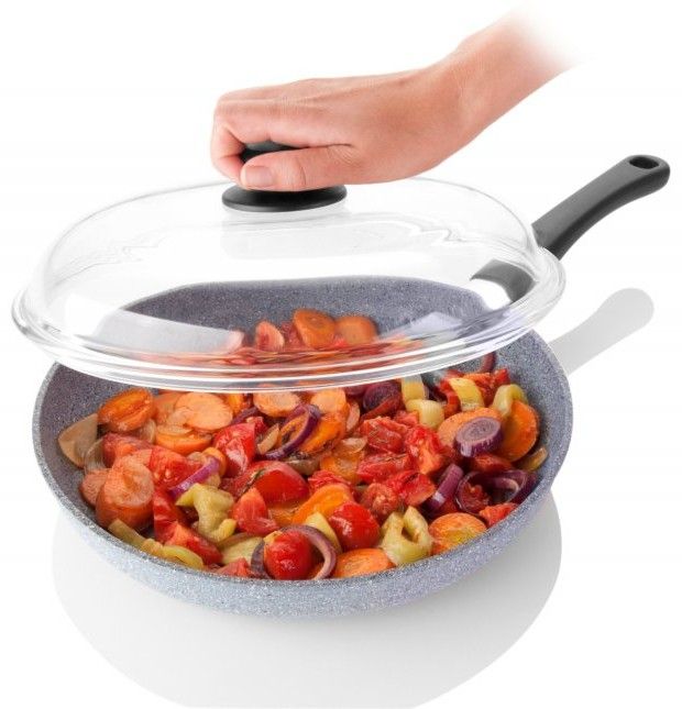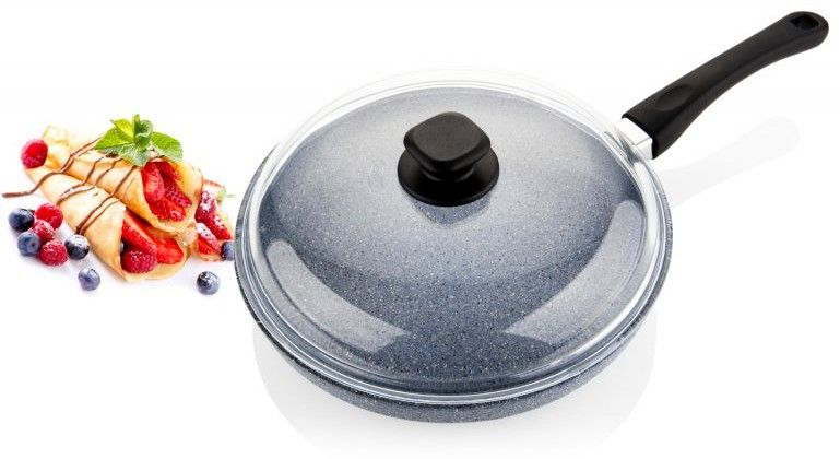 Pánev s nepřilnavým povrchem, granitovou vrstvou a skleněnou poklicí. Vhodná pro přípravu řízků, steaků, omelet a palačinek.