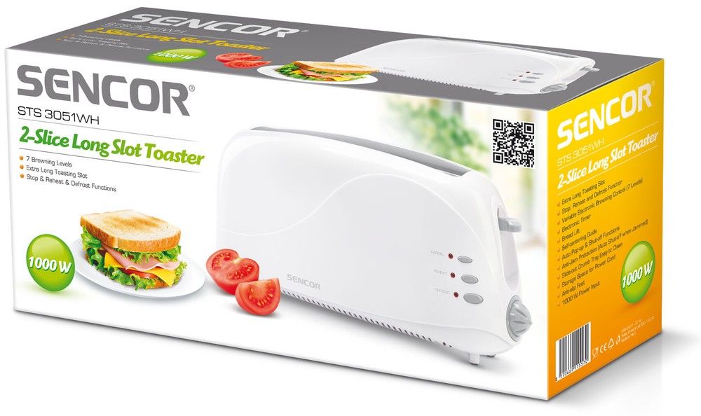 Topinkovač 3v1 s dlouhým otvorem pro opékání 1 celého krajíce chleba nebo 2 toastů. Má elektronický časovač, 7 stupňů intenzity opékání a výsuvnou nádobu na drobky.