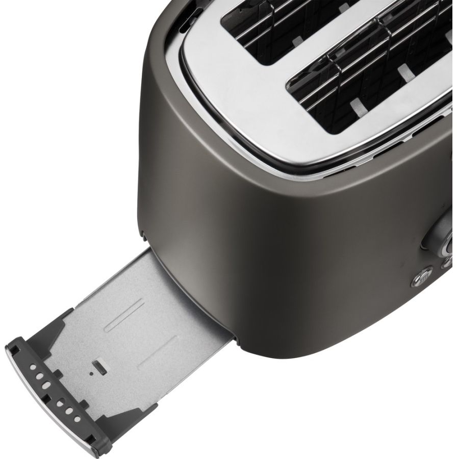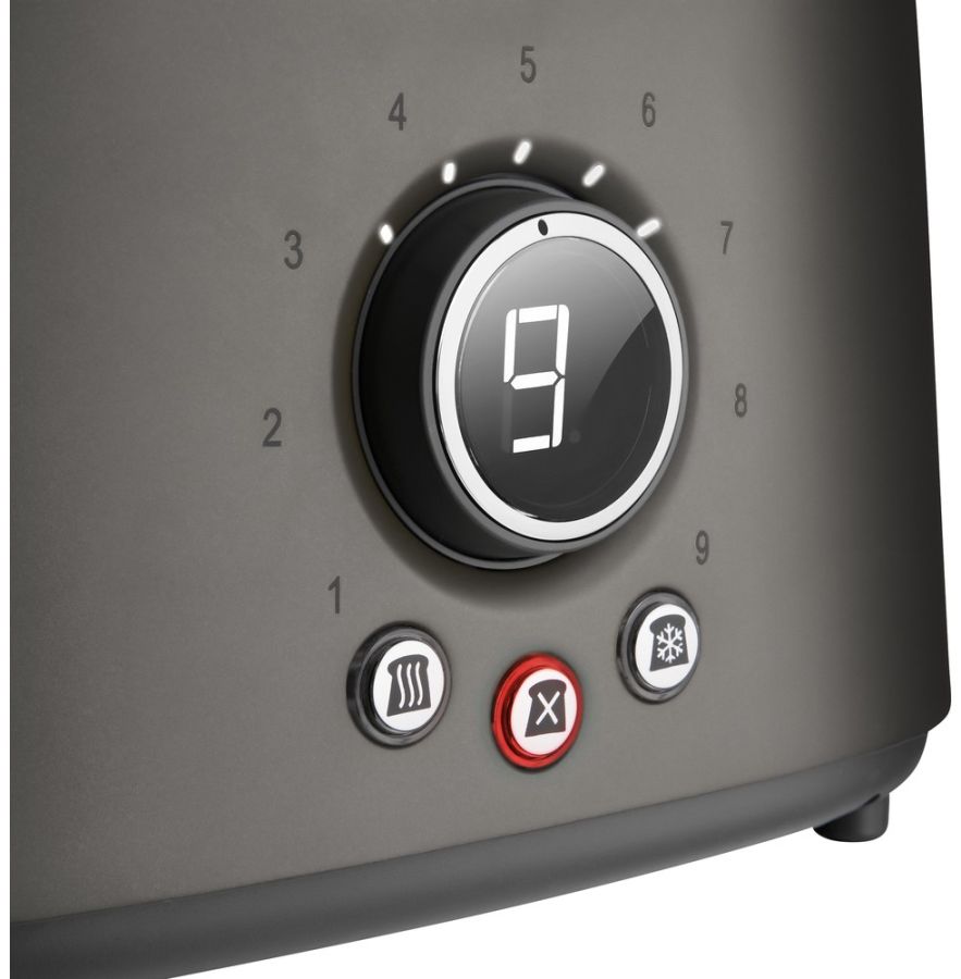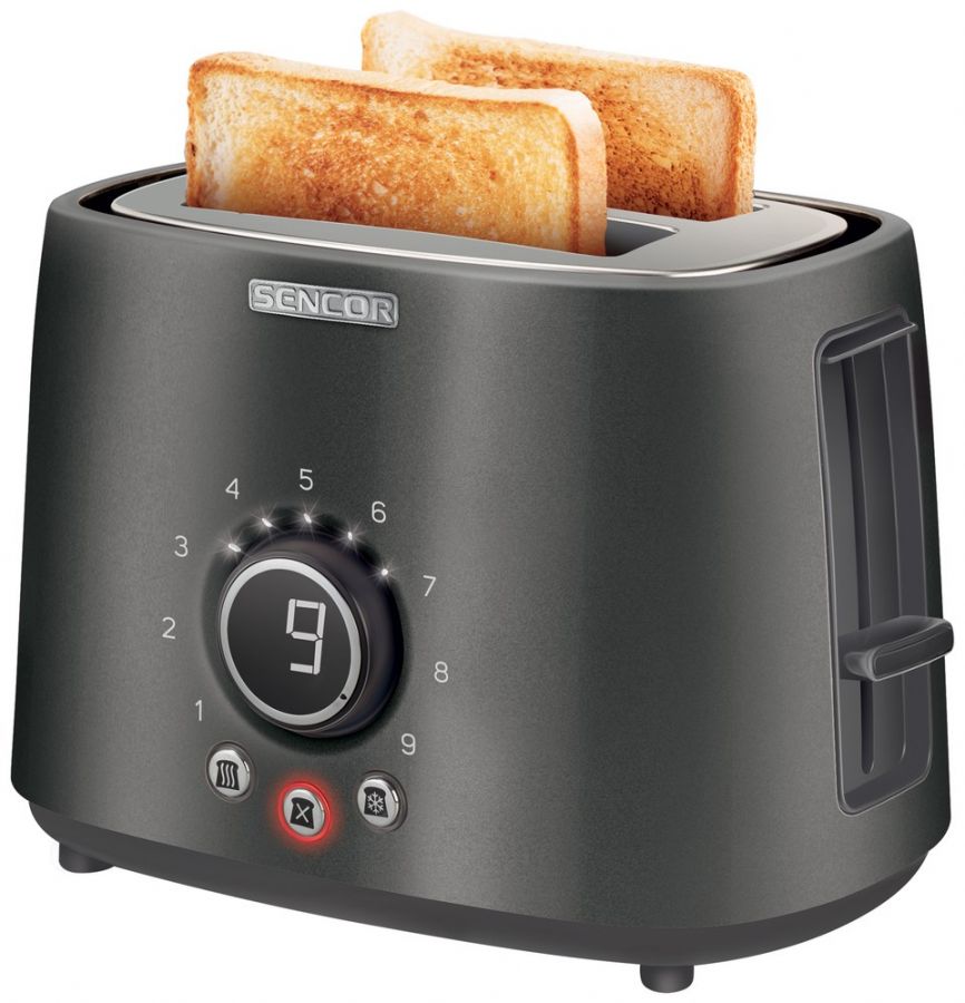 Topinkovač 3v1 pro opékání 2 toastů současně. Má elektronický časovač, 9 stupňů intenzity opékání a výsuvnou nádobu na drobky.