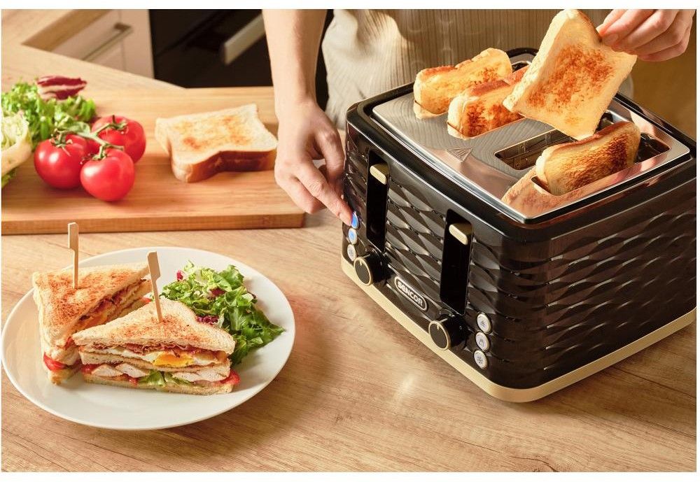 Topinkovač připraví 4 topinky současně. Má 3 funkce v 1, 7 stupňů nastavení intenzity opečení, funkce automatického centrování pro rovnoměrný ohřev silných i tenkých toastů, funkce High Lift pro snadné vyjmutí menších kousků pečiva a vyjímatelnou misku na drobky.