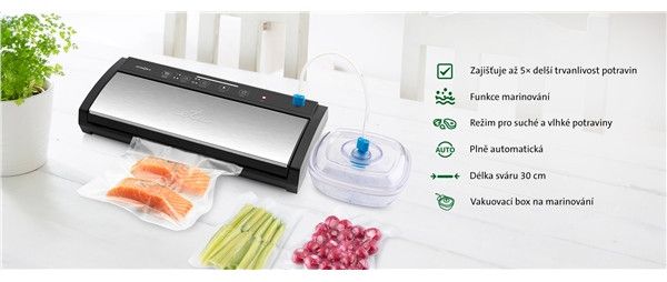 Díky unikátní funkci marinování budete hvězdou každé grilovačky. K tomuto účelu jistě využijete i vakuovací box. Podtlak při vakuování otevírá póry masa a marináda lépe pronikne do jeho struktury. Maso je namarinované rychleji a důkladněji.