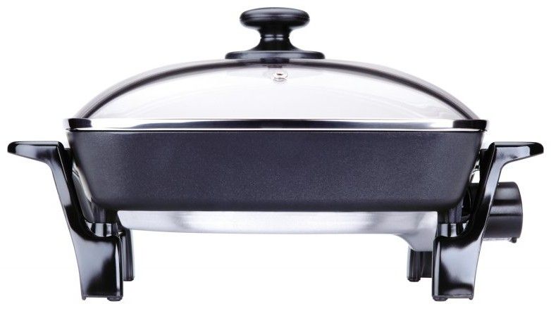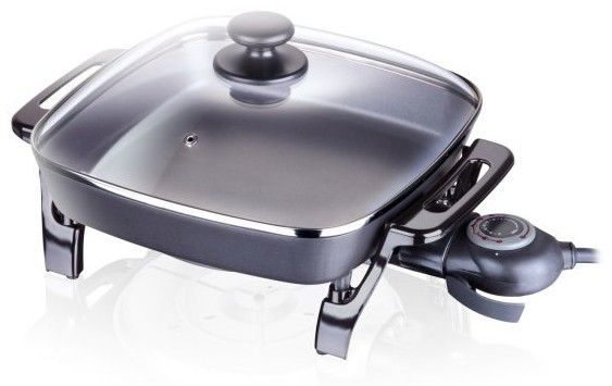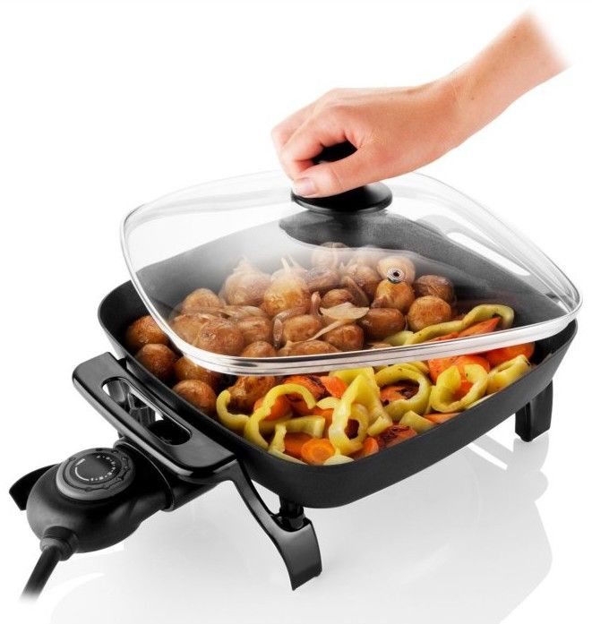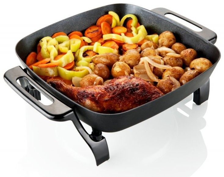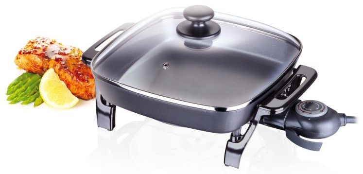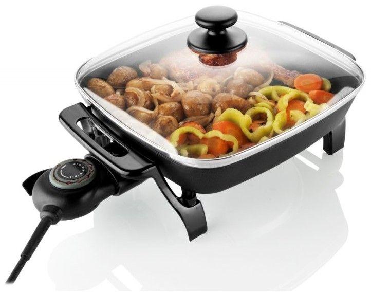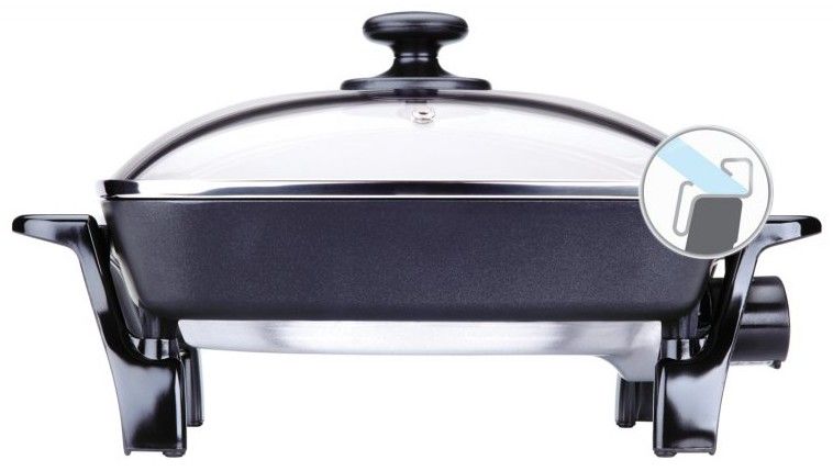 Víceúčelová elektrická pánev umožňuje rychlou a zdravou přípravu pokrmů bez použití tuků. Vhodná na pečení, smažení, dušení i zapékaní. Objem 3 l.
