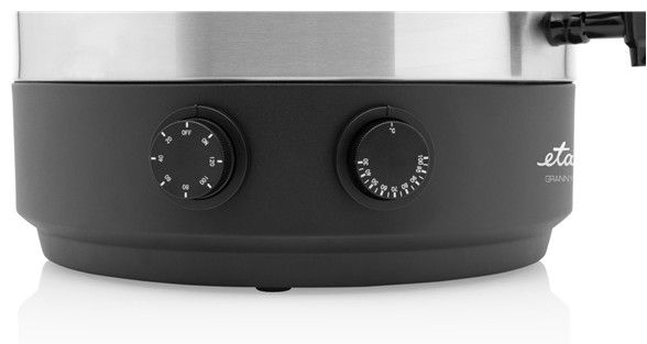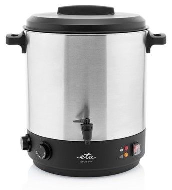 Zavařovací hrnec ETA Granny je vybaven kvalitní nerezovou nádobou o objemu 25 litrů, která pojme až 14 litrových zavařovacích sklenic. Celý proces zavařování vám usnadní odnímatelná nerezová mřížka, plynule nastavitelný termostat (30–100 °C) a nastavitelný časový spínač (na 20–120 minut).