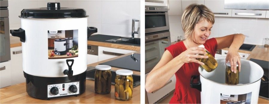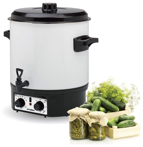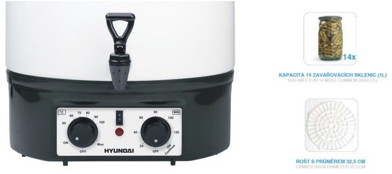Jeho objem 27 l a rošt o průměru 32,5 cm umožní pohodlné zavařování ve 14 sklenicích o objemu 1 l. Požadovanou teplotu snadno nastavíte pomocí plynulého termostatu v rozsahu 50 - 100 °C a na její dosažení upozorní zvukový signál. K dispozici máte i časový spínač v rozsahu 20 až 120 minut, zvolit lze i nepřetržitý chod. Vodu snadno vypustíte pomocí výpustného kohoutu. Nádoba je opatřena kvalitním smaltem, topné těleso je pod rovným dnem. Rukojeti hrnce jsou tepelně izolovány, nechybí ochrana proti přehřátí a chodu naprázdno.