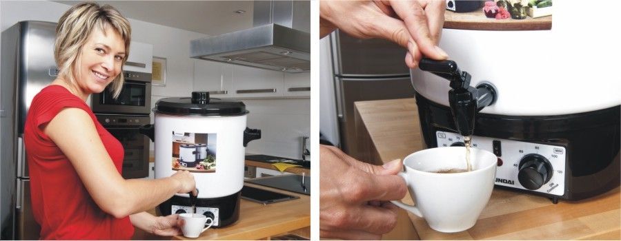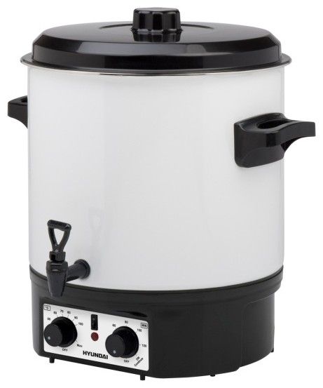 Zavařovací hrnec o objemu 27 l pro 14 sklenic, vybavený plynulým termostatem a 120 min. časovačem, v požadované teplotě udrží horké nápoje, guláš či polévky.
