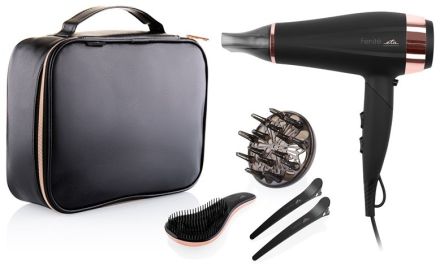 Fen s funkcí ionizace v praktické taštičce doplněný difuzérem, kartáčem na vlasy a klipy na sepnutí pro pohodlný styling.