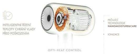 Inteligentní řízení teploty OPTI-HEAT CONTROL poskytne vlasům vždy optimální teplotu v závislosti na způsobu používání fénu. Speciální nanotechnologie zvlhčování vlasů NanoMoisture&Care přitom uzamkne vláhu uvnitř vlasu, a tím zajistí jeho pružnost a „šťavnatost“.
