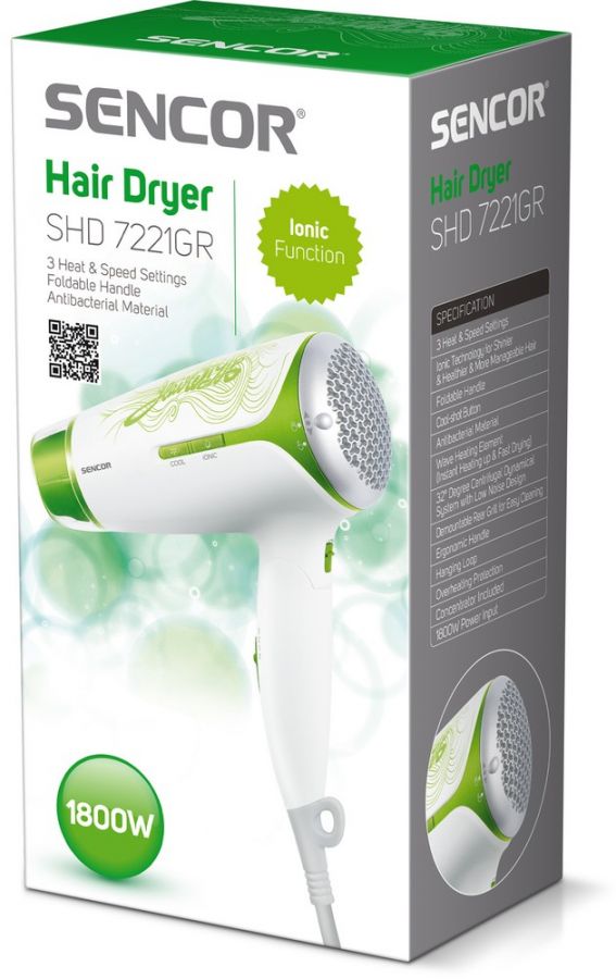 Lehký cestovní fen s funkcí ionizace generuje negativní ionty. Má 2 rychlosti a celkem 3 teploty, tlačítko studeného vzduchu pro rychlou fixaci účesu, sklopnou rukojeť a tepelnou pojistku proti přehřátí motoru.