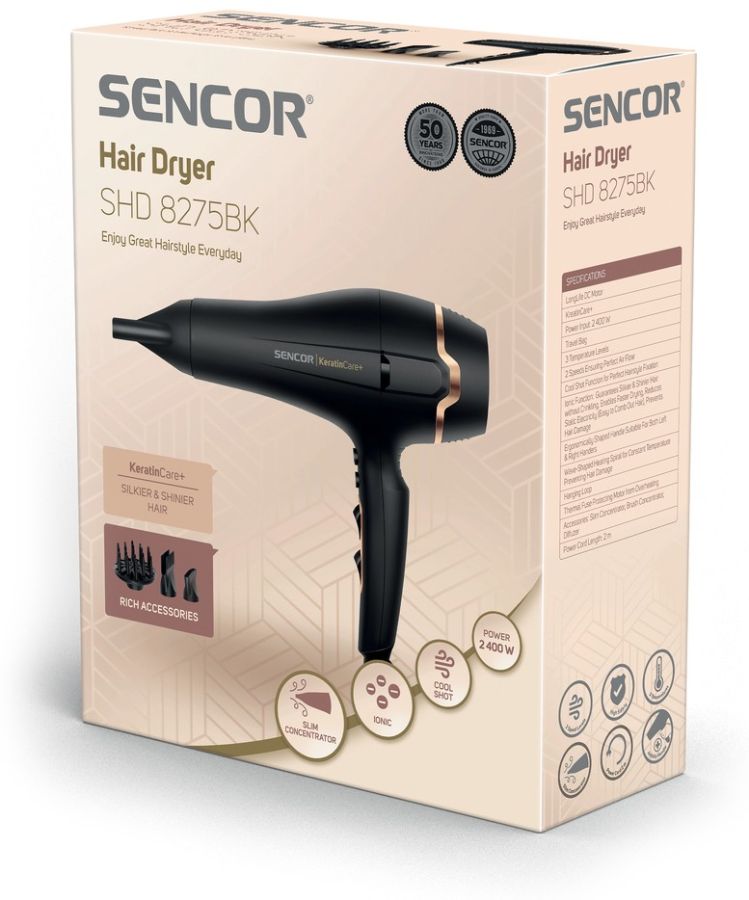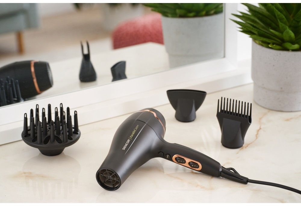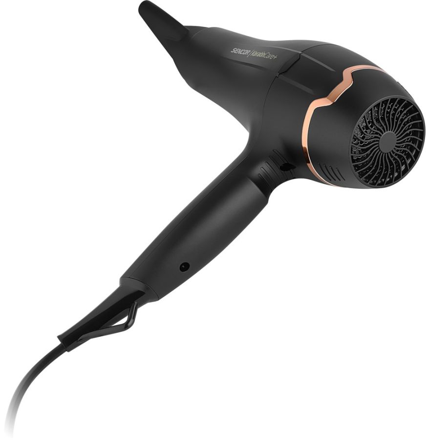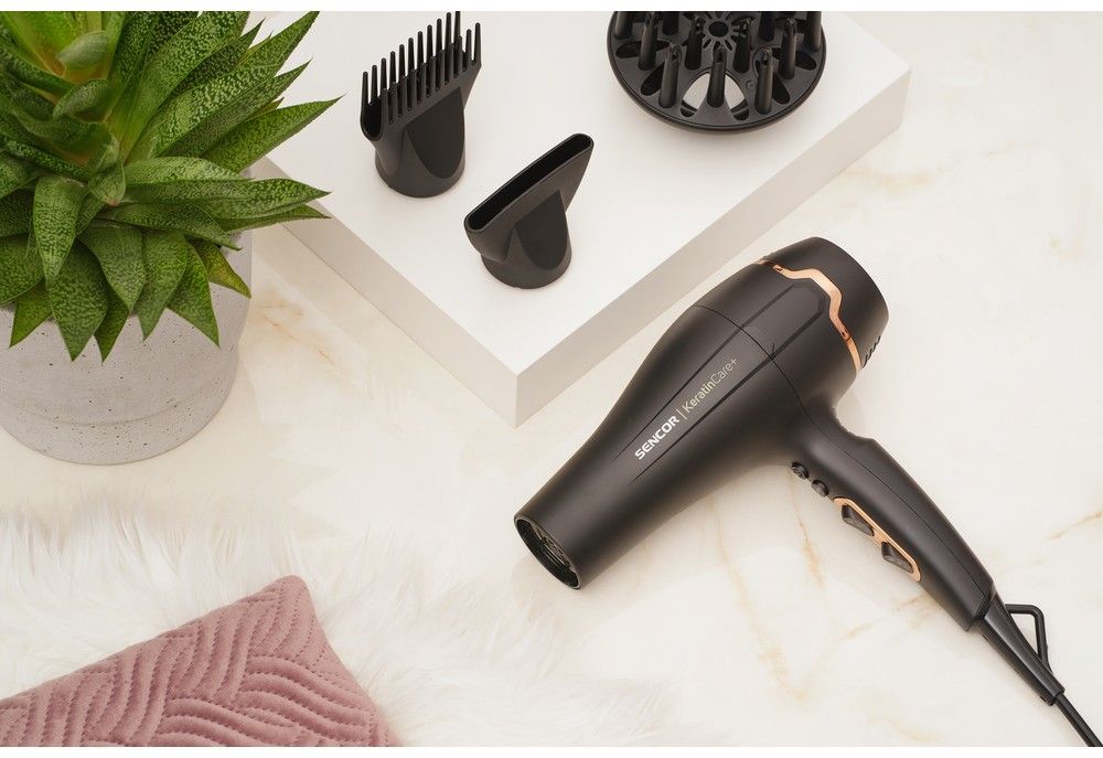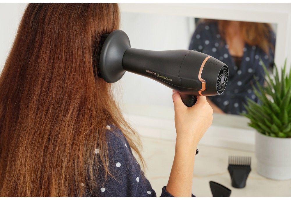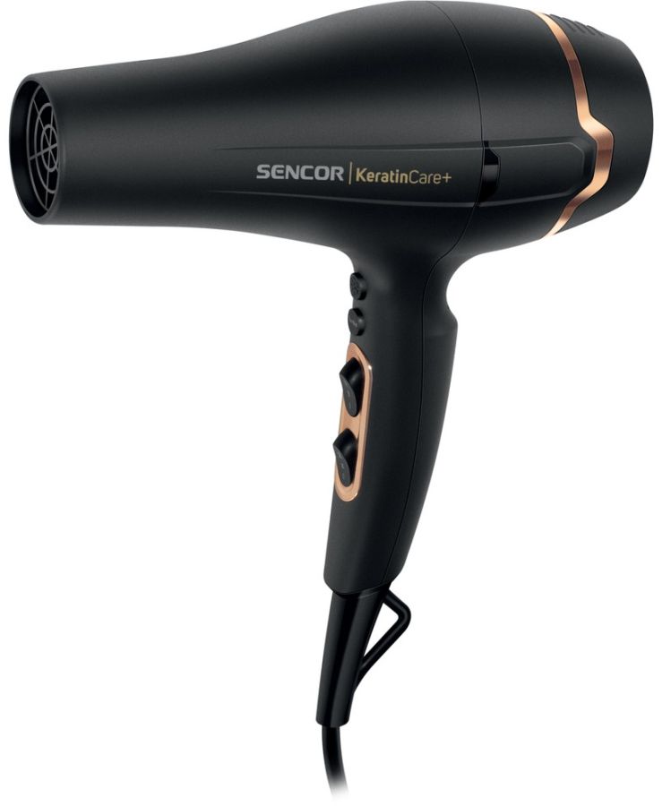 Fen s výkonným AC motorem s dlouhou životností, keratinem, 3 stupni teploty, 2 stupni rychlosti, ionizací a pojistkou proti přehřátí.